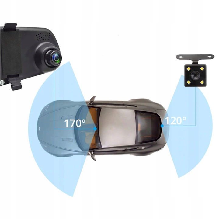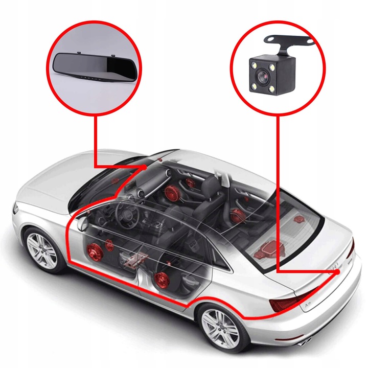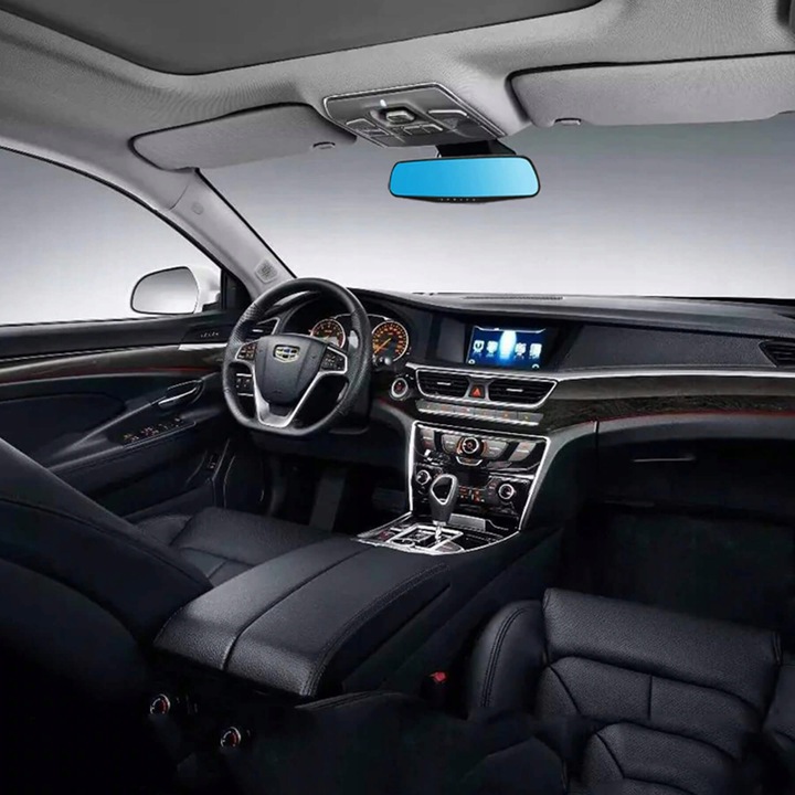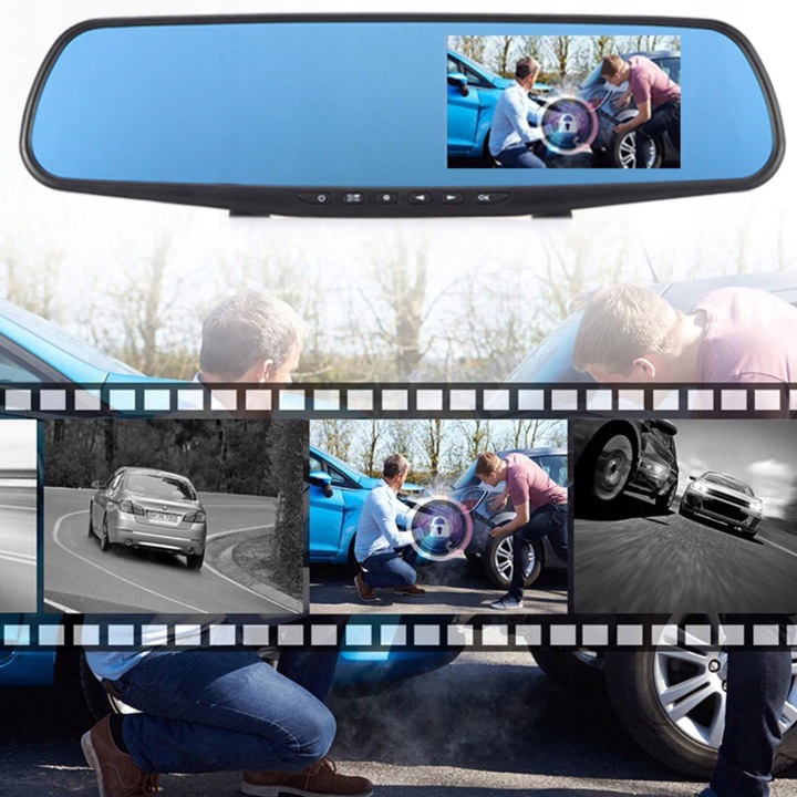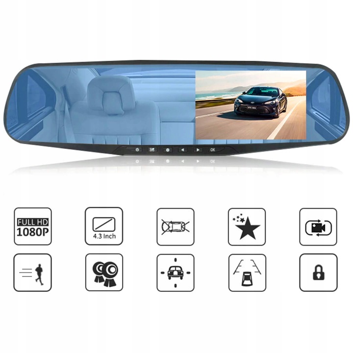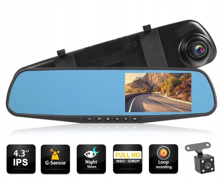 багатофункціональний пристрій для установки всередині автомобіля на оригінальне дзеркало заднього виду. На дзеркалі розміщений великий 4,3-дюймовий дисплей, завдяки якому ми можемо бачити те, що відбувається перед автомобілем і безпосередньо за ним. пристрій має функцію камери заднього виду. при включенні заднього ходу на нашому дисплеї автоматично зʼявляється зображення з задньої камериразом з допоміжними лініями для паркування.ще одна корисна функція- одночасний запис з обох камер. Запис записується на карту памʼяті, а її можна відтворити безпосередньо на пристрої або вставивши карту памʼяті в компʼютер