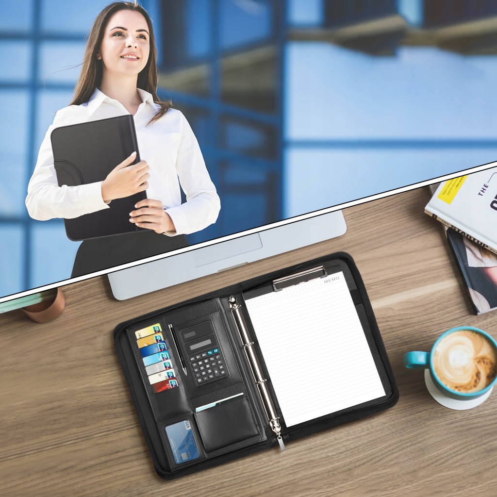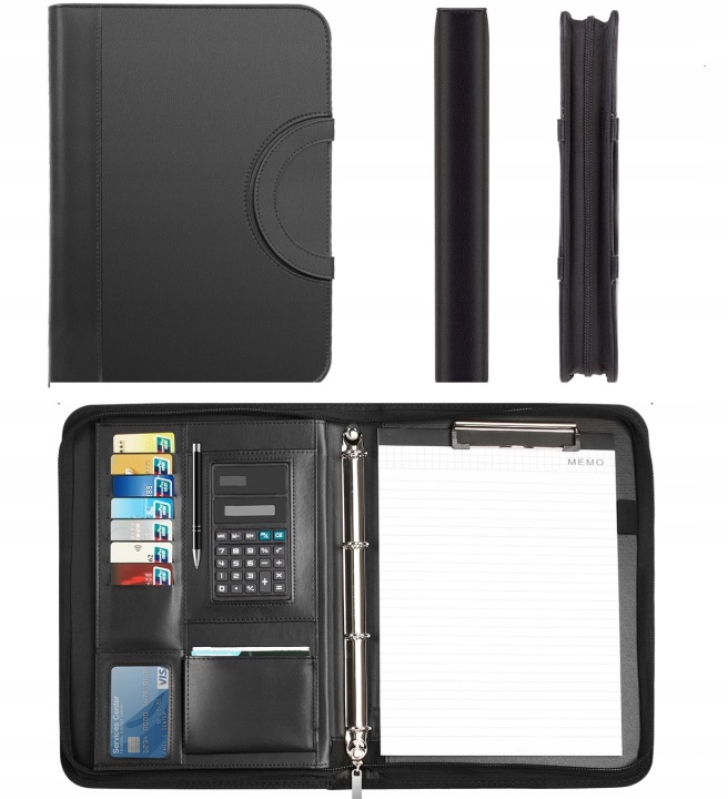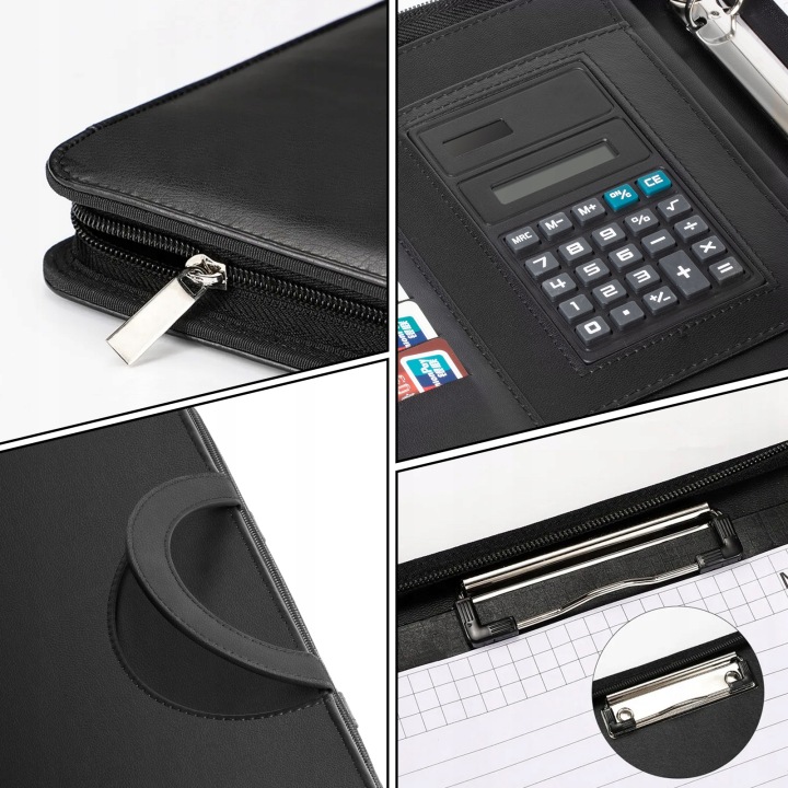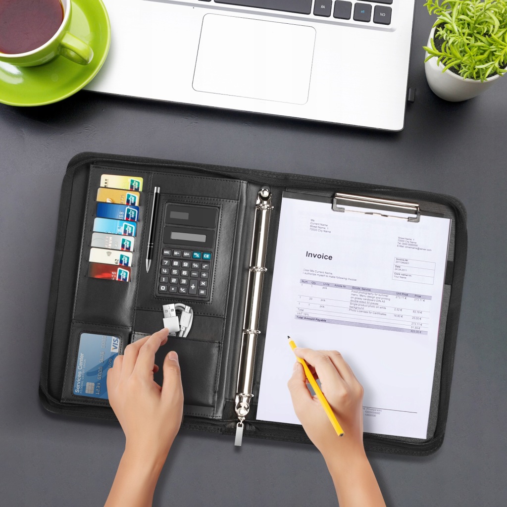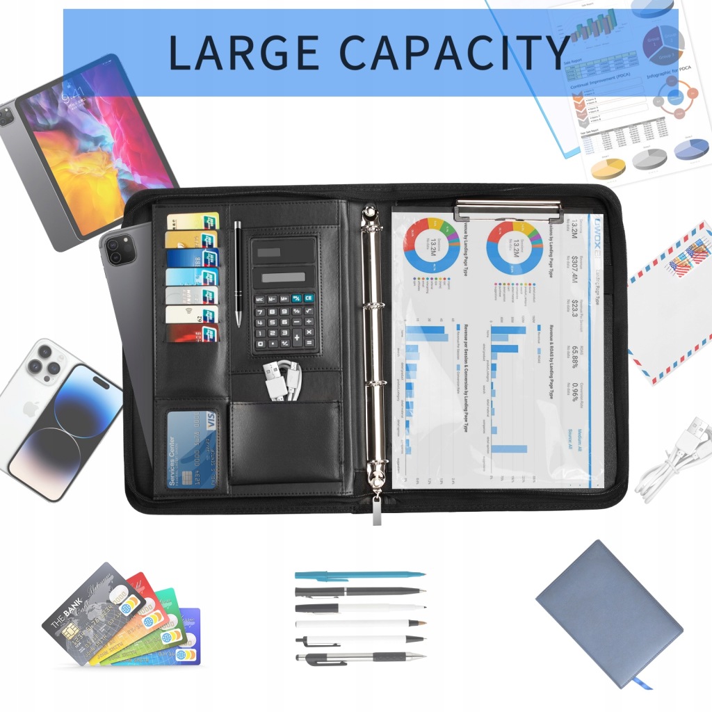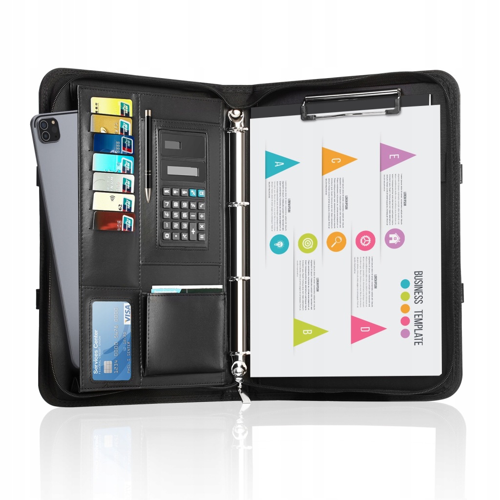 папка для 4 кілець, 8 відділень для карт, кишені для документів, замітки формату А4, калькулятор і ручка, великий розмір для iPad.