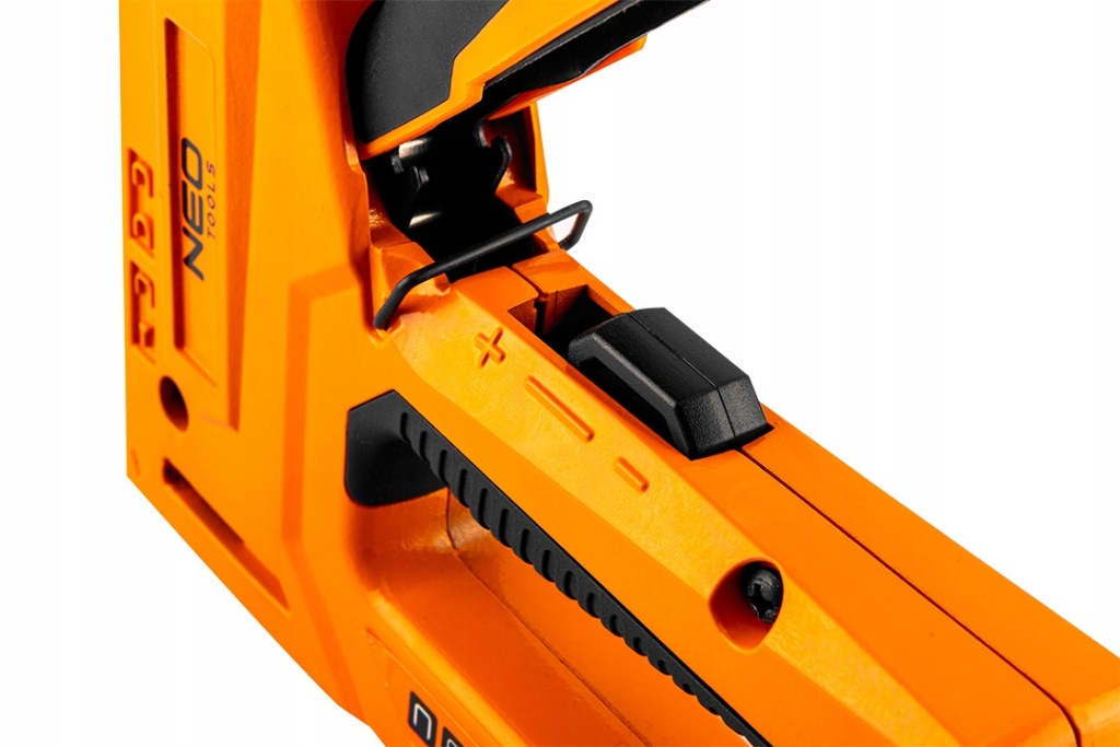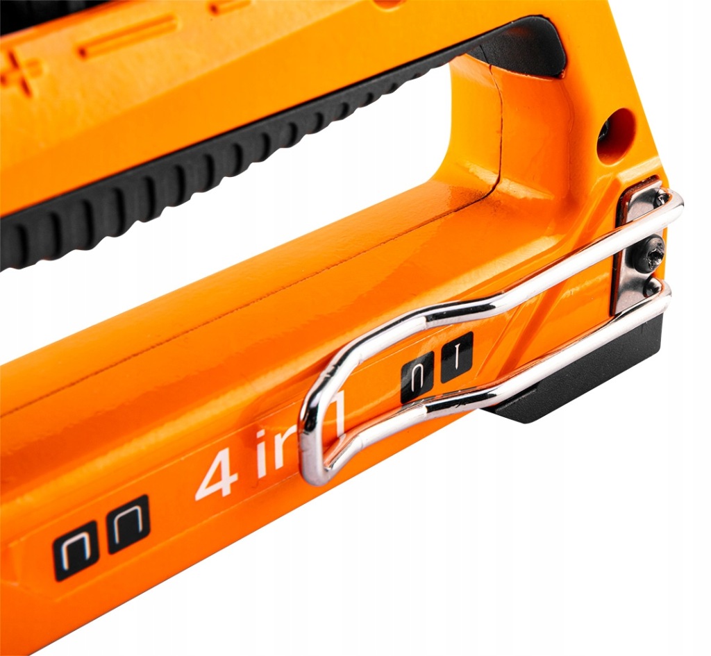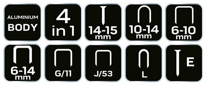 багатофункціональний Степлер для оббивки 4 в 1 NEO (арт. 16-030) для скоби типу J, G, L, E, розміром від 6 до 14 мм.відмінно працює в оббивних, декоративних роботах, в кріпленні плівки, шкіри та інших матеріалів. Завдяки регулюванню сили забивання скоб може використовуватися як для твердих, так і для мʼяких матеріалів. Він точно добиває скоби, не роздавлюючи їх, навіть в тверді матеріали. Корпус степлера виконаний з алюмінію.