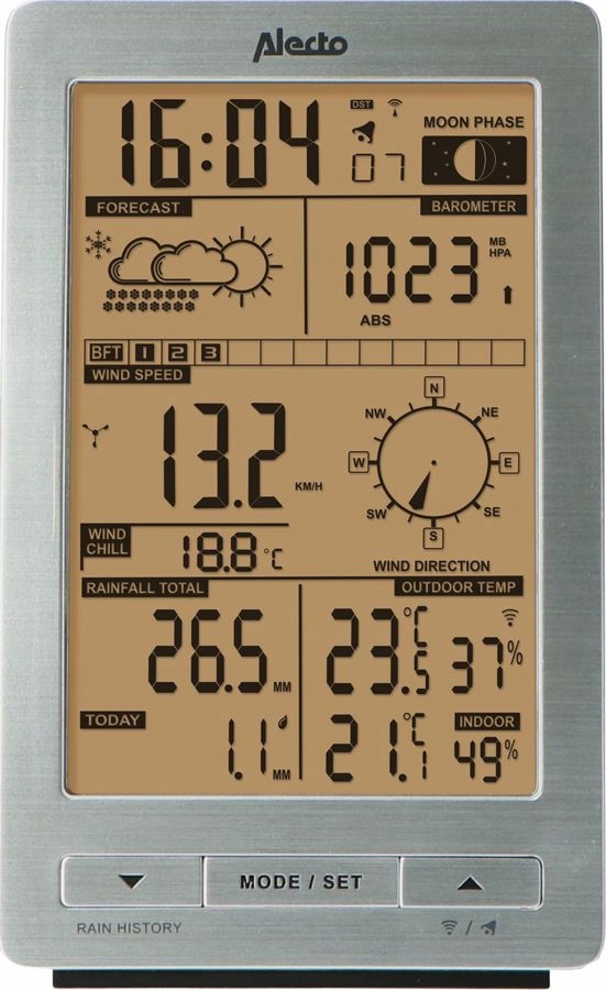 дисплей з підсвічуванням цієї метеостанції Alecto показує анімований прогноз погоди, який є точним і своєчасним. Дані про опади можуть бути показані WS-3300 на годину, протягом 24 годин, на тиждень і на місяць. Таким чином, ви завжди можете запросити обширний огляд
