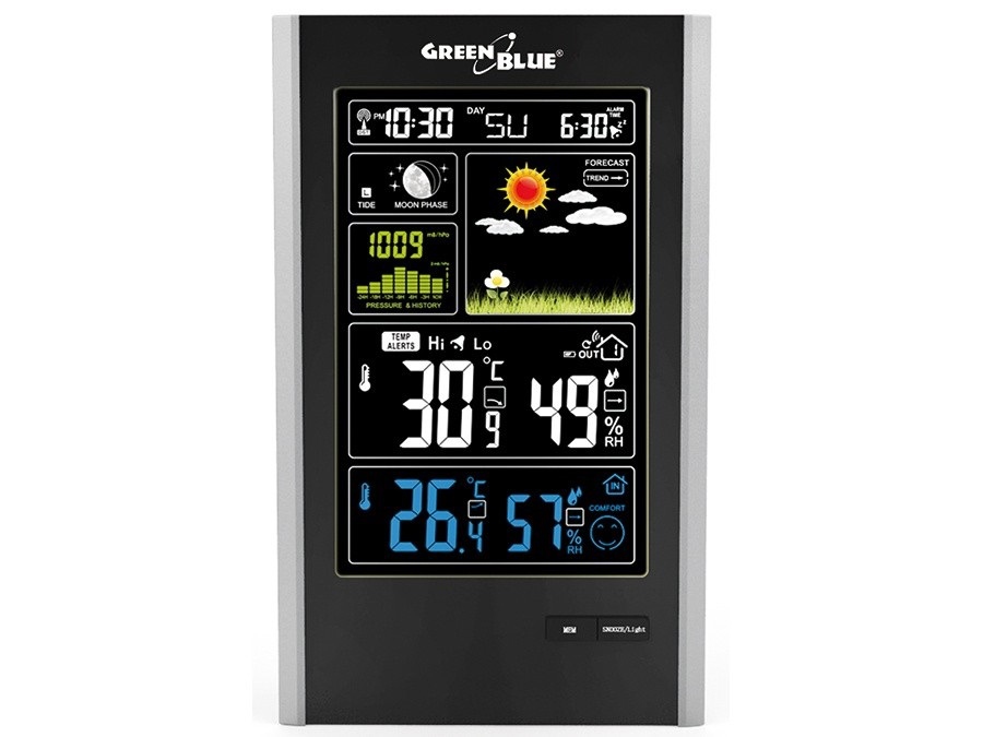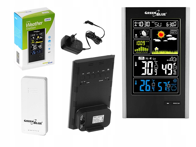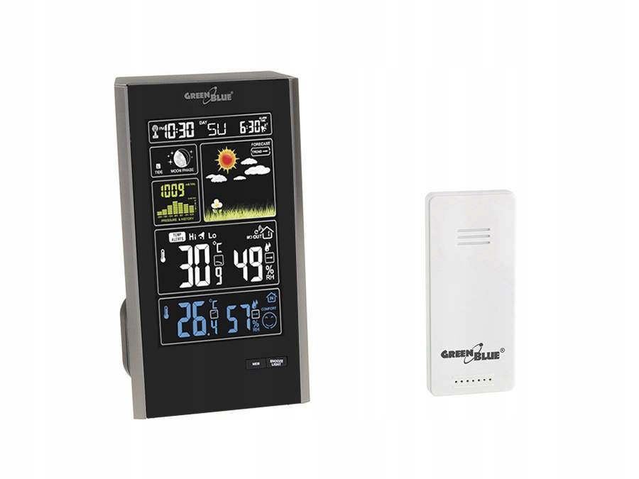 бездротова метеостанція з функцією DCF і повтору. Великий, легко читається кольоровий екран відображає внутрішню і зовнішню температуру одночасно. Відображає фази місяця, а також тиск повітря, інформацію про температуру та вологість, а також форму хвилі тиску.