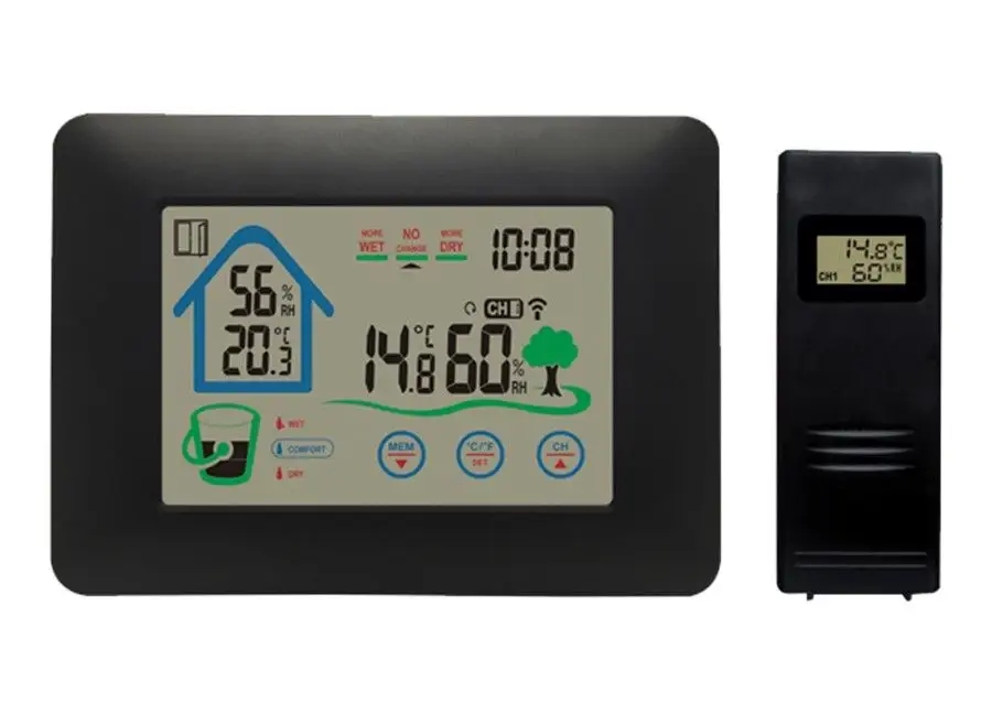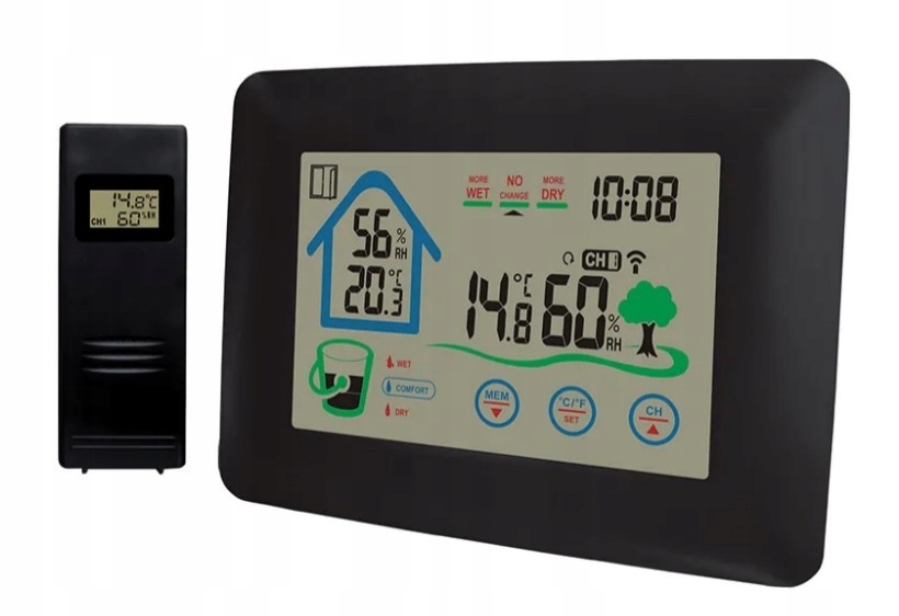 ми представляємо сенсорну метеостанцію з годинником, що ідеально підходить для моніторингу погодних умов у вашому домі. Оснащений трьома клавішами на сенсорному екрані, він забезпечує просте управління і доступ до різних функцій. З опцією 12/24 годин ви можете вибрати бажаний формат відображення часу, який найбільше відповідає вашим потребам. Крім того, метеостанція дозволяє вибирати одиницю температури між градусами Цельсія і Фаренгейта, забезпечуючи гнучкість при читанні даних. Метеостанція оснащена індикатором відкриття / закриття вікна.він також пропонує показники температури та вологості як у приміщенні, так і на вулиці. Таким чином, ви завжди будете в курсі поточних погодних умов, що дозволить вам відповідним чином адаптувати навколишнє середовище до ваших уподобань. Метеостанція також реєструємаксимальні та мінімальні температури як всередині, так і зовні . Крім того, Індекс внутрішнього комфорту дозволяє оцінити, чи оптимальні погодні умови в приміщенні. Тенденція вологості на відкритому повітрі, з іншого боку, дозволяє спостерігати зміни вологості на відкритому повітрі та надає цінну інформацію про клімат. Метеостанція має широкий діапазон температур в приміщеннівід 0°C до +50°cі діапазон температур в приміщенні від -40°C до +70°C, що дозволяє контролювати екстремальні погодні умови. Діапазон внутрішньої / вихідної вологості становить від 20% до 90%, що дозволяє контролювати вологість у приміщенні та на відкритому повітрі. в комплект входить 1 зовнішній датчик, який дозволяє збирати дані з навколишнього середовища. Основний блок метеостанції живиться від 3 батарейок AAA (не входить в комплект), в той час як для зовнішнього датчика потрібно 2 батарейки AA (також не входять в комплект).