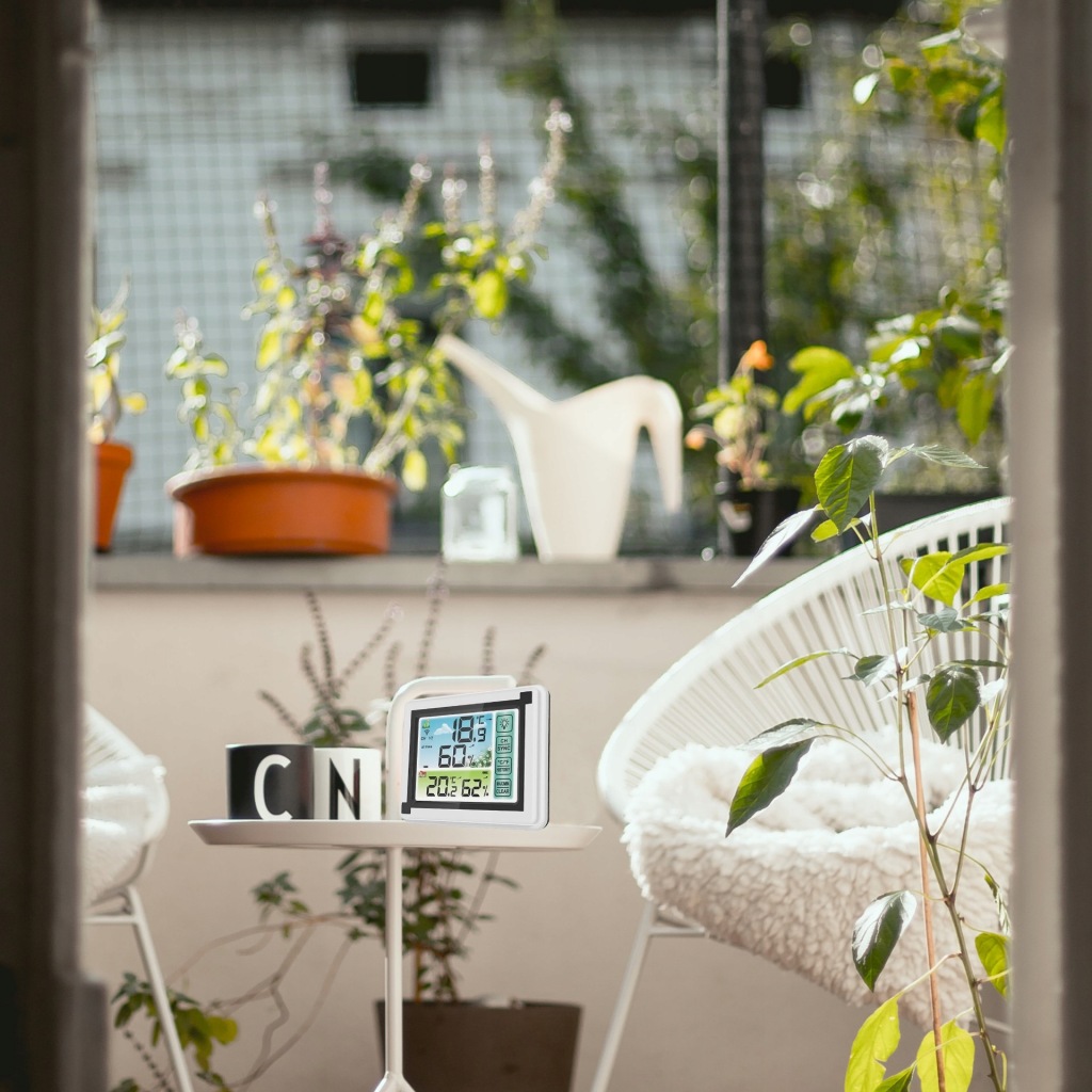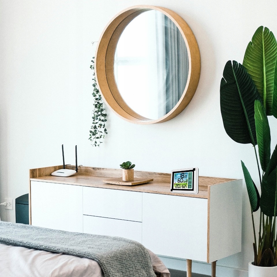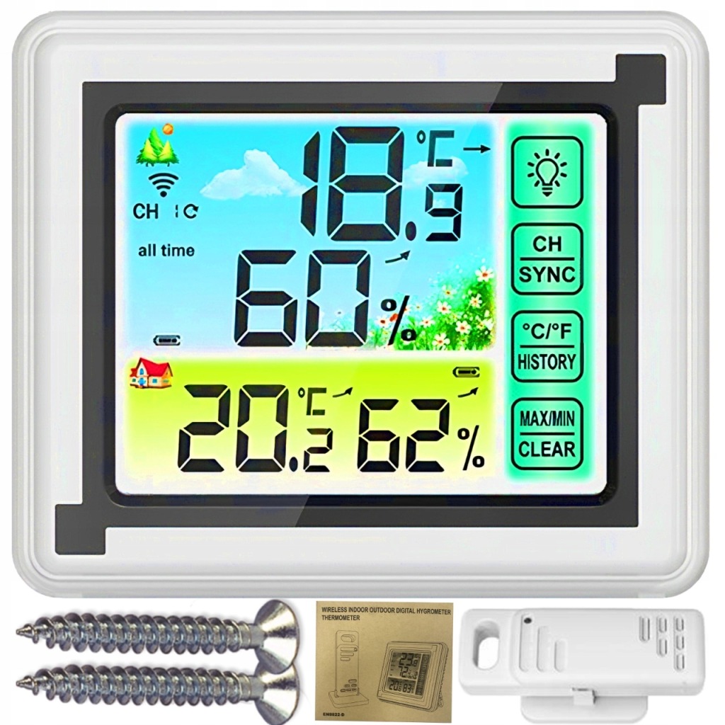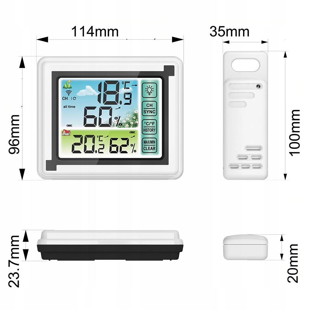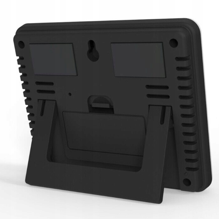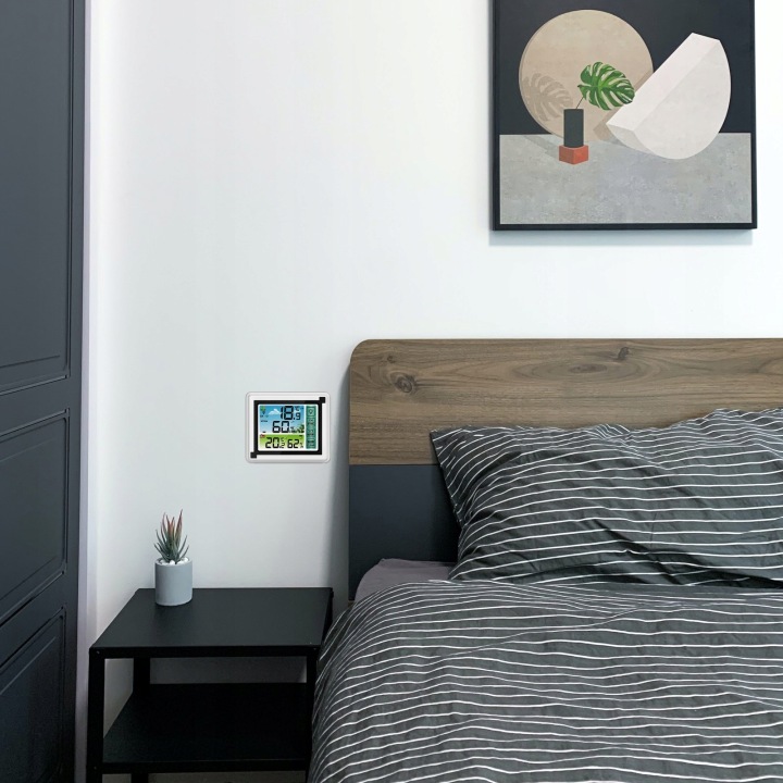 зручний прилад для щоденного контролю температури в приміщенні . Він також має додаткові функції вимірювання вологості .продукт оснащений зручним для читання РК-дисплеєм . Виготовлений із пластику білого кольору, підходить для інтерʼєрів з різною колірною гамою.Станція може бути встановлена безпосередньо на столі або полиці або підвішена на стіні в будь-якій кімнаті.