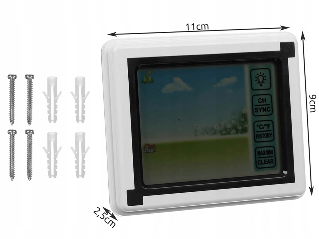 бездротова метеостанція-це сучасний аксесуар, який оснащений чітким дисплеєм, з якого кожен без проблем зможе зчитувати виміряні в даний момент значення. Пристрій оснащений 4 кнопками: підсвічування екрану, CH / synch - вибір каналу або синхронізація читання, градуси/ history-перемикання одиниць виміру, історія записів, і макс.хв. / clear-мінімальна і максимальна запис і опція очищення памʼяті.