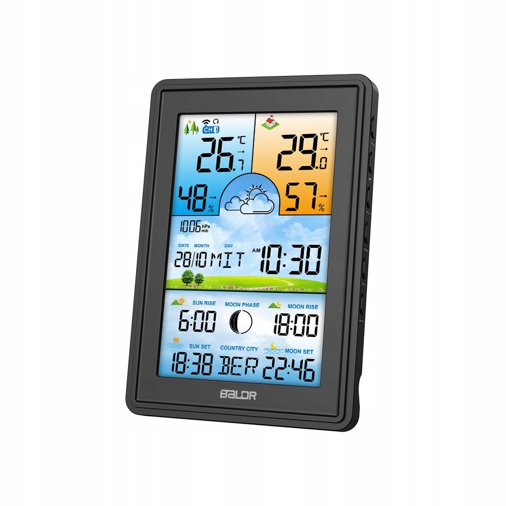 бездротова метеостанція-це багатофункціональний пристрій, корисне в будь-якому будинку. Станція виконує вимірювання таких значень, як температура і вологість, а також має функцію годинник, будильник з функцією повтору, фази Місяця, прогноз погоди на найближчі 12-24 години і календар. Пристрій має в комплекті зовнішній датчик з діапазоном 40 метрів, завдяки якому можна вимірювати як в приміщенні, так і за межами будівлі. Зазначені значення оновлюються на постійній основі. Станція має індикатор тренду, попередження про високу і низьку температуру на відкритому повітрі і функцію попередження про заморозки, а також зберігає найнижчі і найвищі вимірювання температури і вологості. Додатковою і дуже корисною особливістю є чотириступінчаста регулювання підсвічування дисплея, тому можна налаштувати яскравість відповідно до особистих переваг.