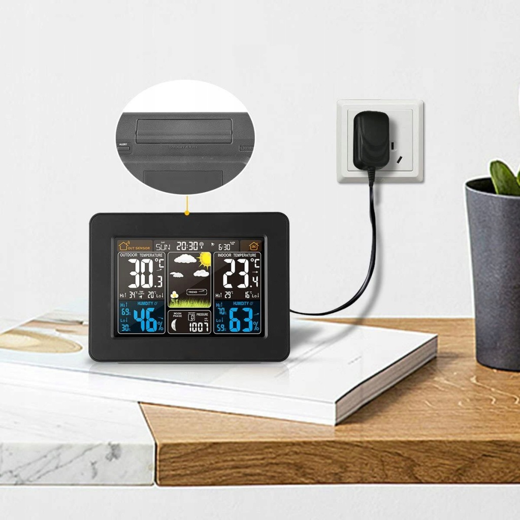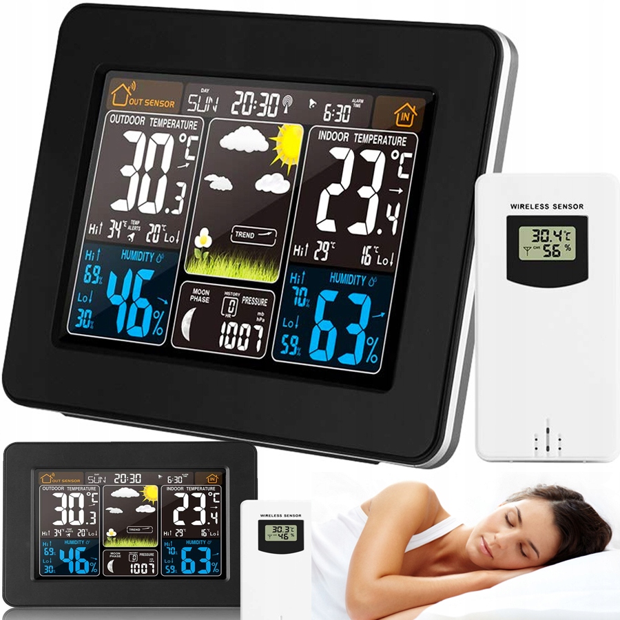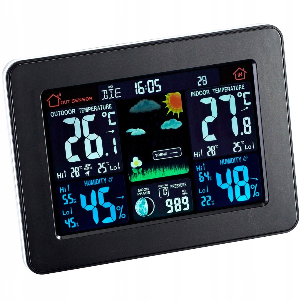 електронна погода є дуже точним пристроєм , просто швидкий погляд на екран, щоб дізнатися, що чекає нас зовні. На додаток до погоди, яку ми можемо очікувати в цей день, Ми перевіримо ще вологість повітря і переважаючий тиск. Він також має годинник з будильником, тому Ви можете успішно встановити його в спальні, щоб перевірити погоду відразу після пробудження і не проспати до роботи.