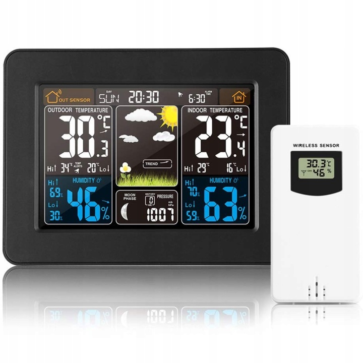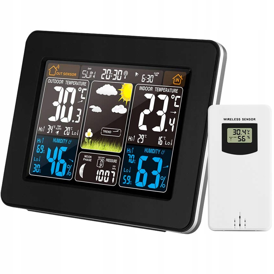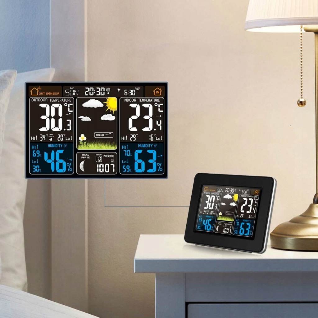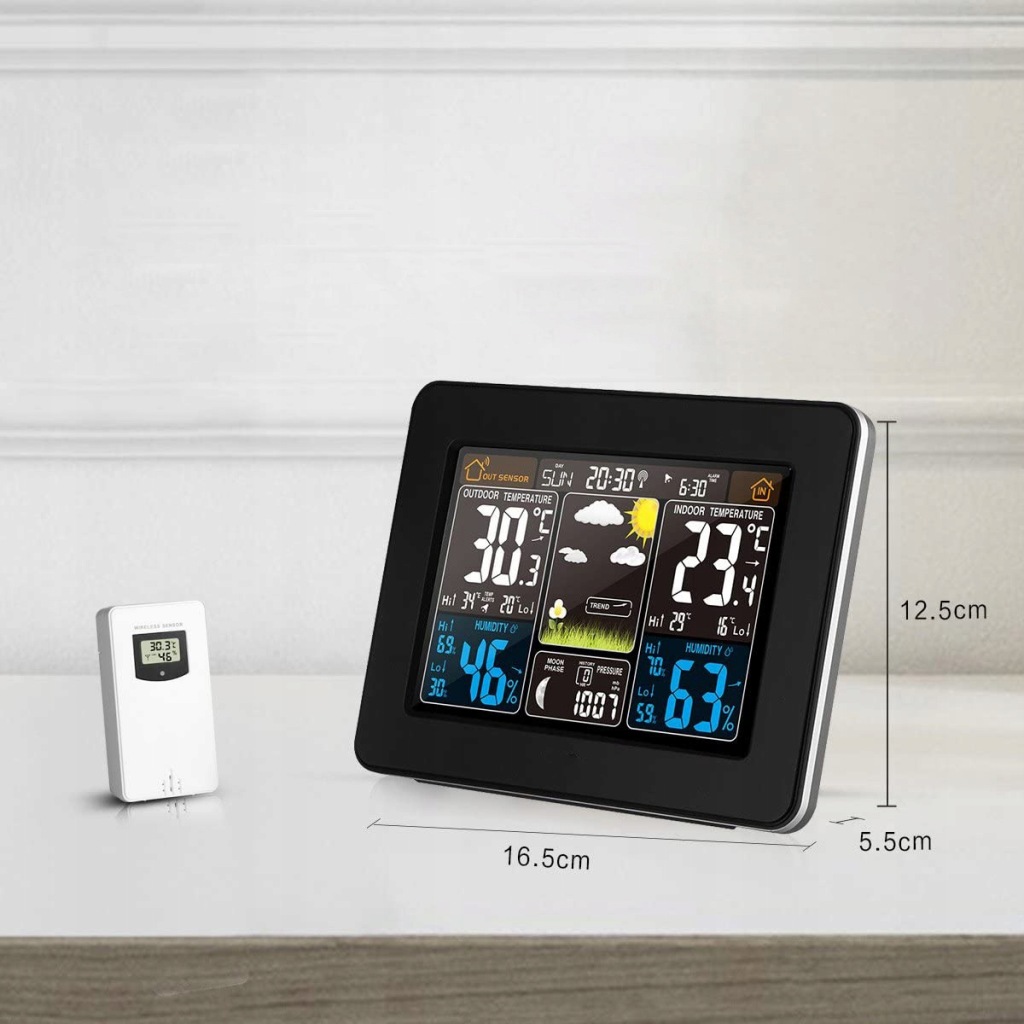 електронна погода є дуже точним пристроєм , просто швидкий погляд на екран, щоб дізнатися, що чекає нас зовні. На додаток до погоди, яку ми можемо очікувати в цей день, Ми перевіримо ще вологість повітря і переважаючий тиск. Він також має годинник з будильником, тому Ви можете успішно встановити його в спальні, щоб перевірити погоду відразу після пробудження і не проспати до роботи.