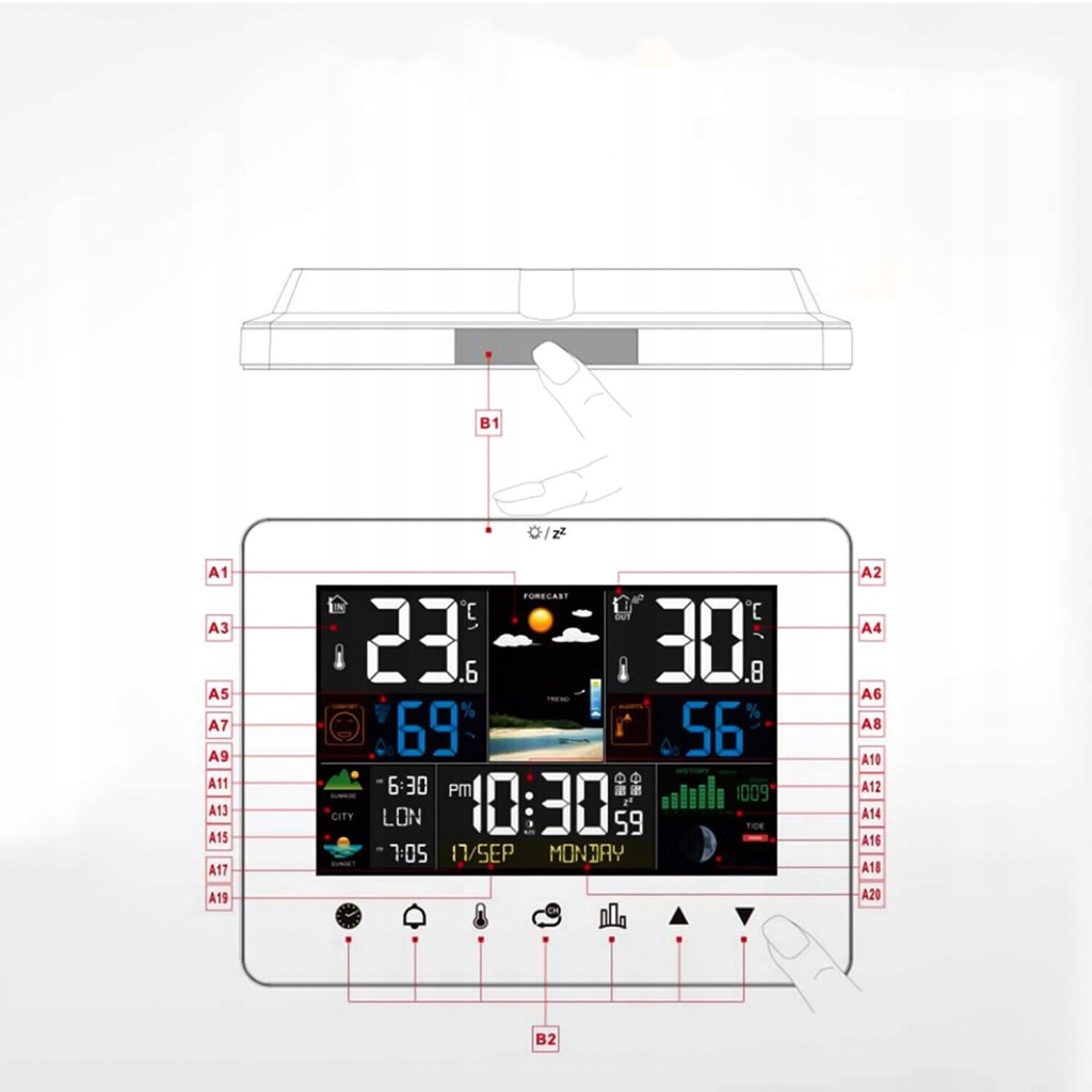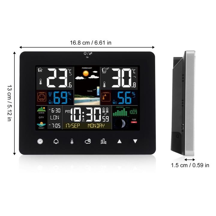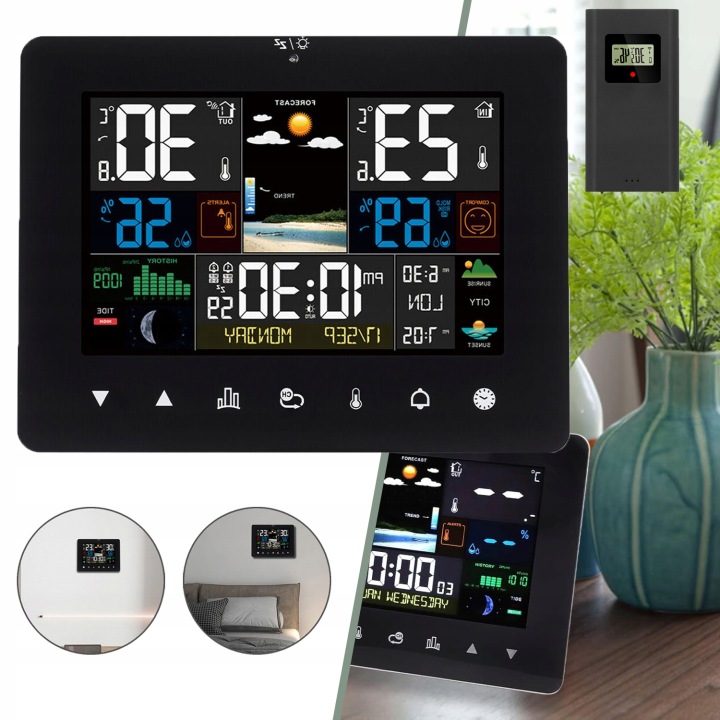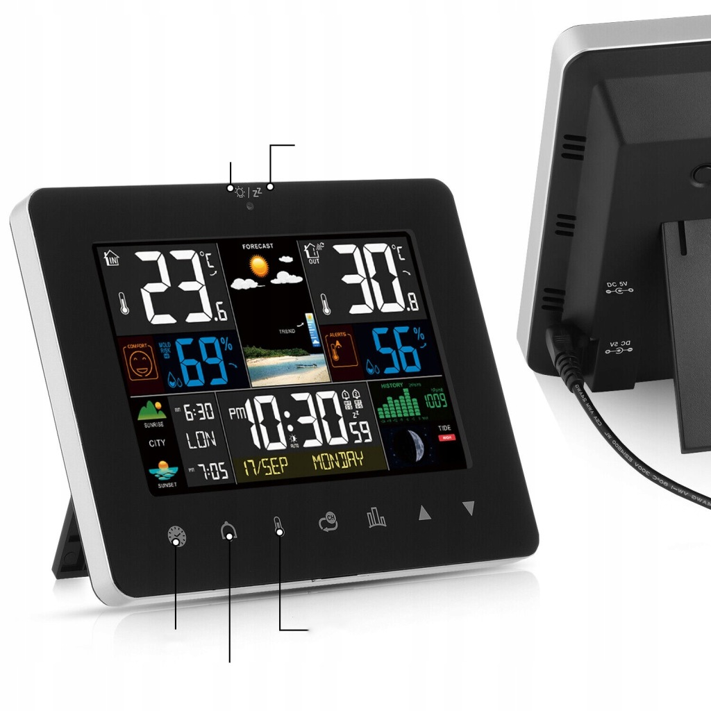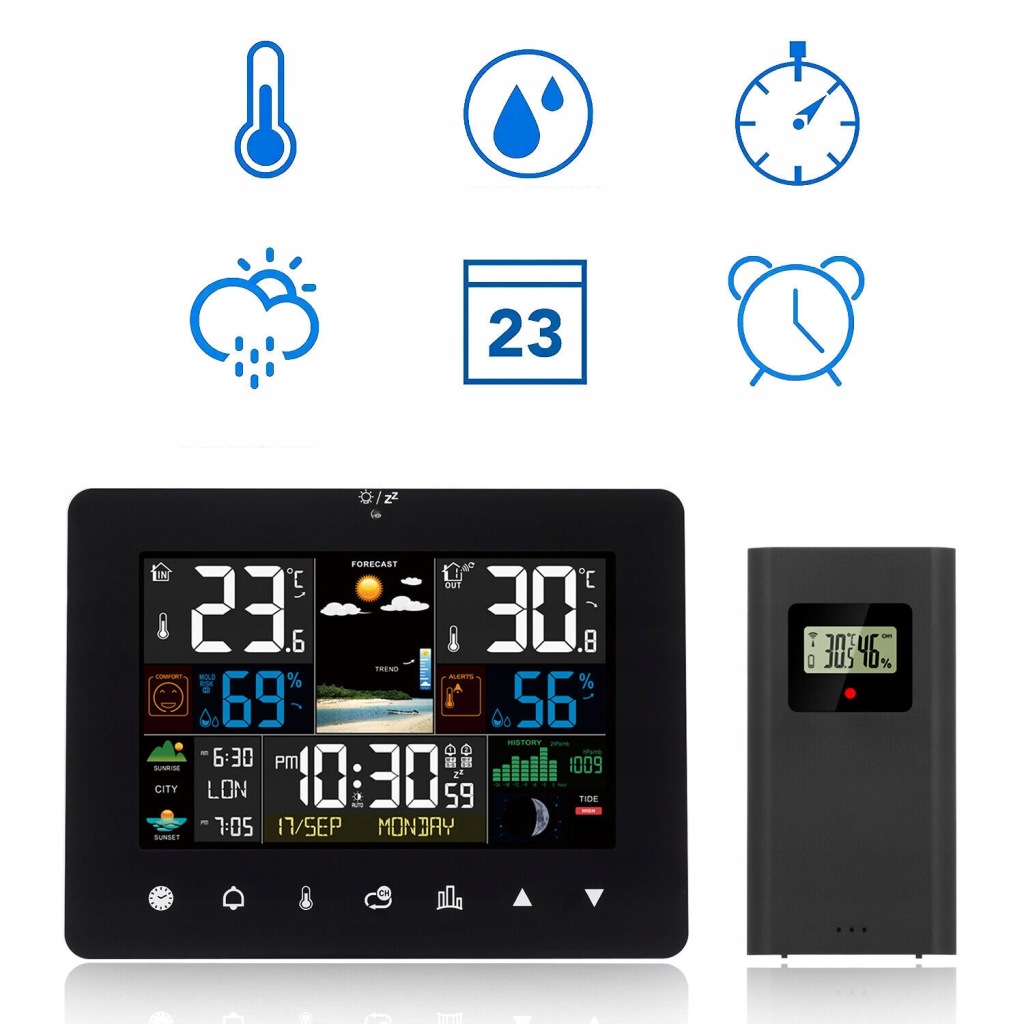 【【повний спектр функцій, включаючи】 відображення температури в приміщенні і на вулиці, прогноз погоди з календарем, Індикатор фази Місяця, комфорт, чіткий кольоровий дисплей з функцією затемнення, відображення часу, дати і робочого дня, функція будильника, відображення вологості повітря (всередині і зовні)), відображення тиску повітря (зовні), бездротовий зовнішній датчик з РК-дисплеєм.
