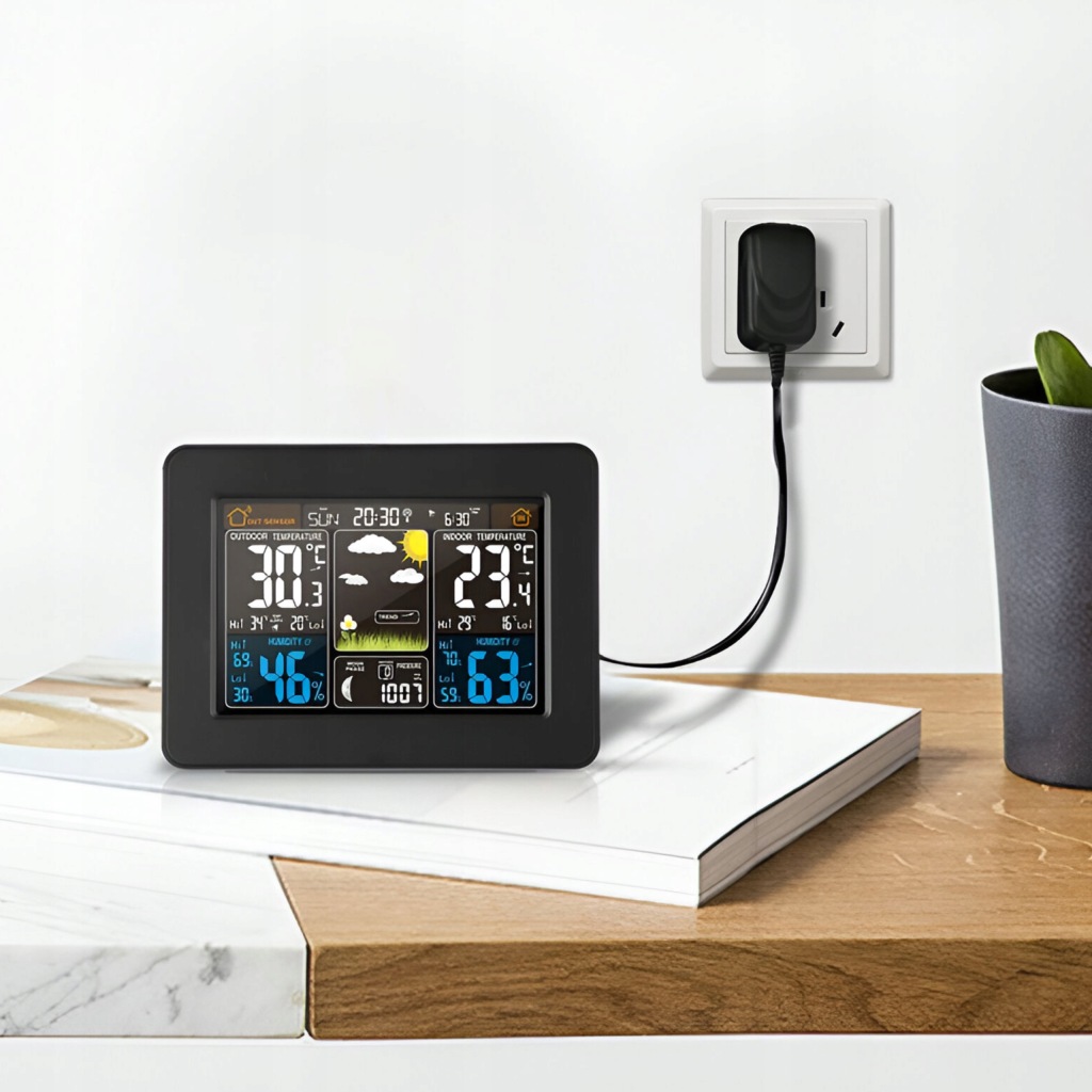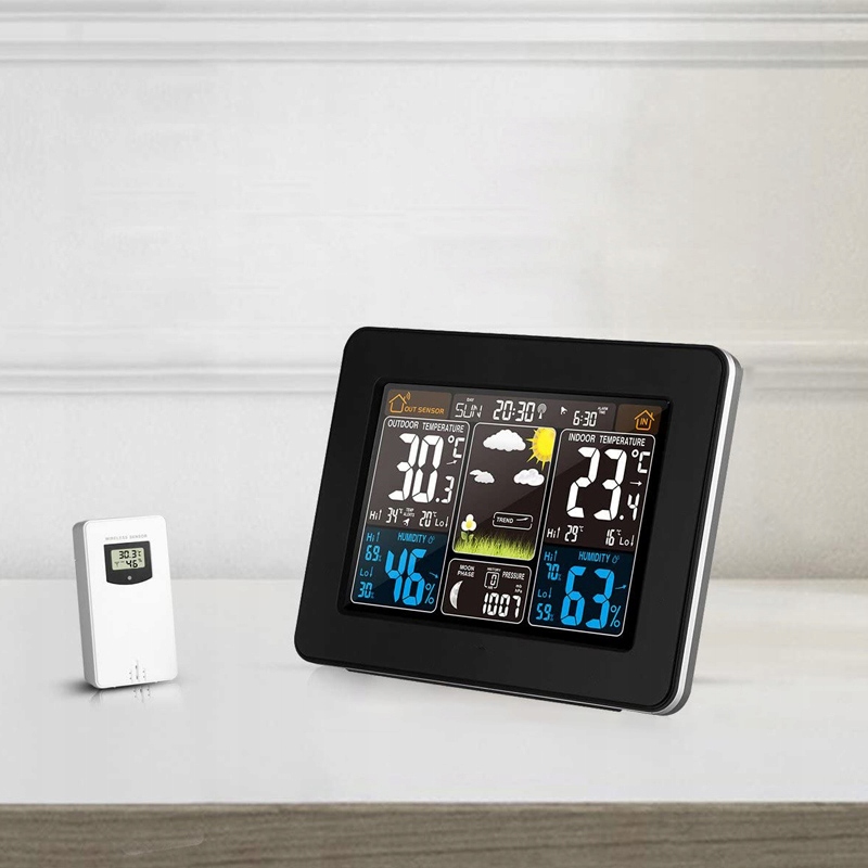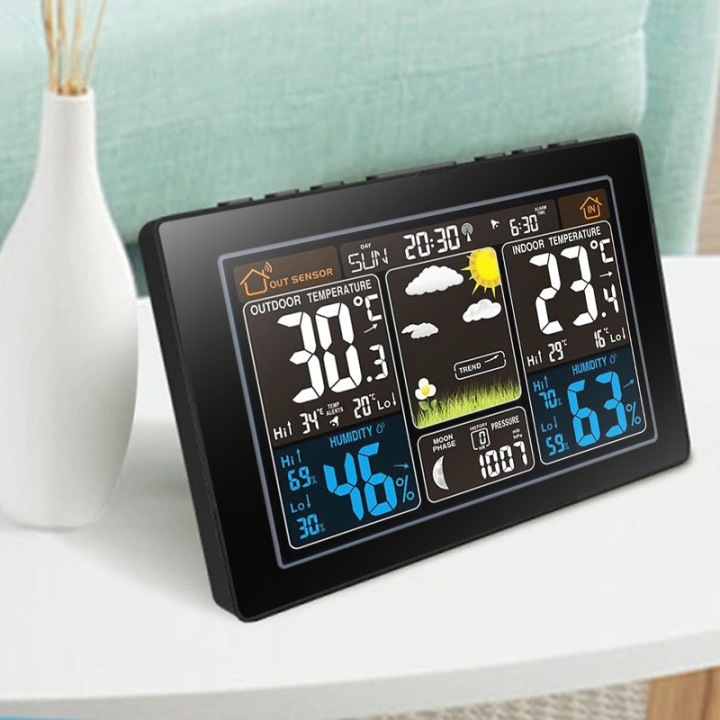 сучасна багатофункціональна метеостанція з великим і чітким РК-дисплеєм інтуїтивно зрозуміла і проста у використанні . відмінно підійде в будь-якому будинку, квартирі, офісі. За допомогою підставки ви можете розмістити її в будь-якому місці, на столі, столі, холодильнику, полиці. він відмінно вписується в декор приміщень своїм тонким зовнішнім виглядом, а його великий дисплей дозволяє легко читати.