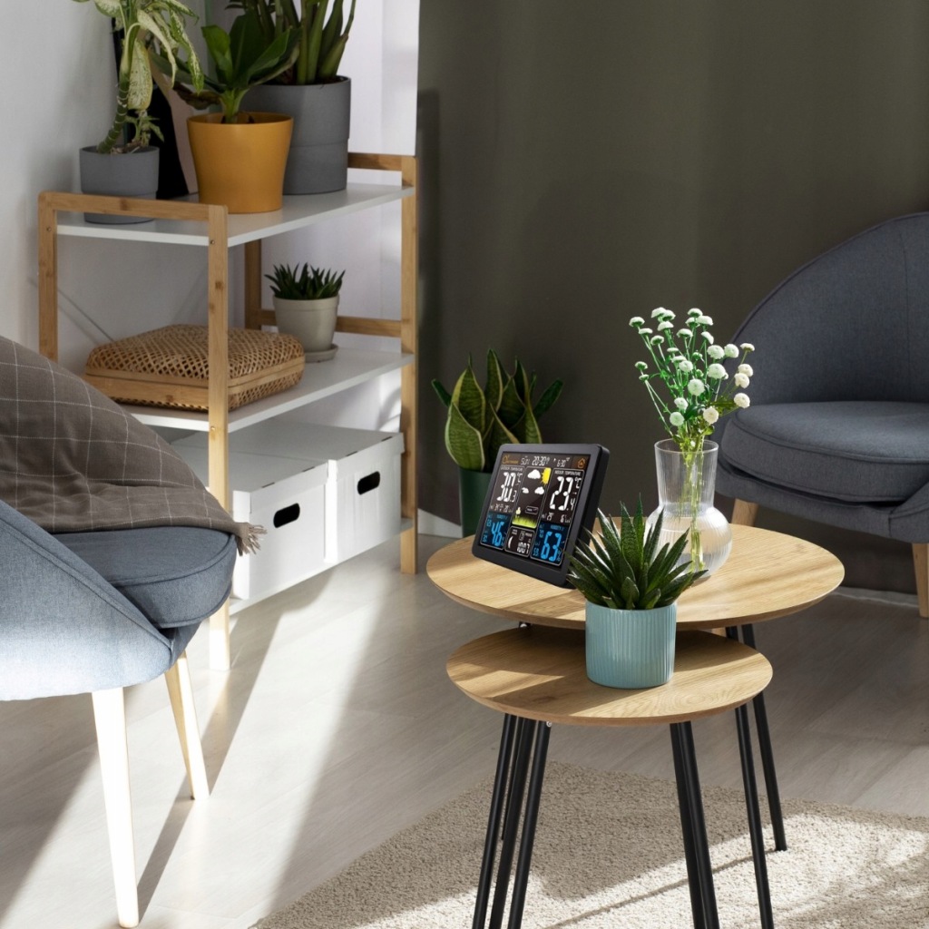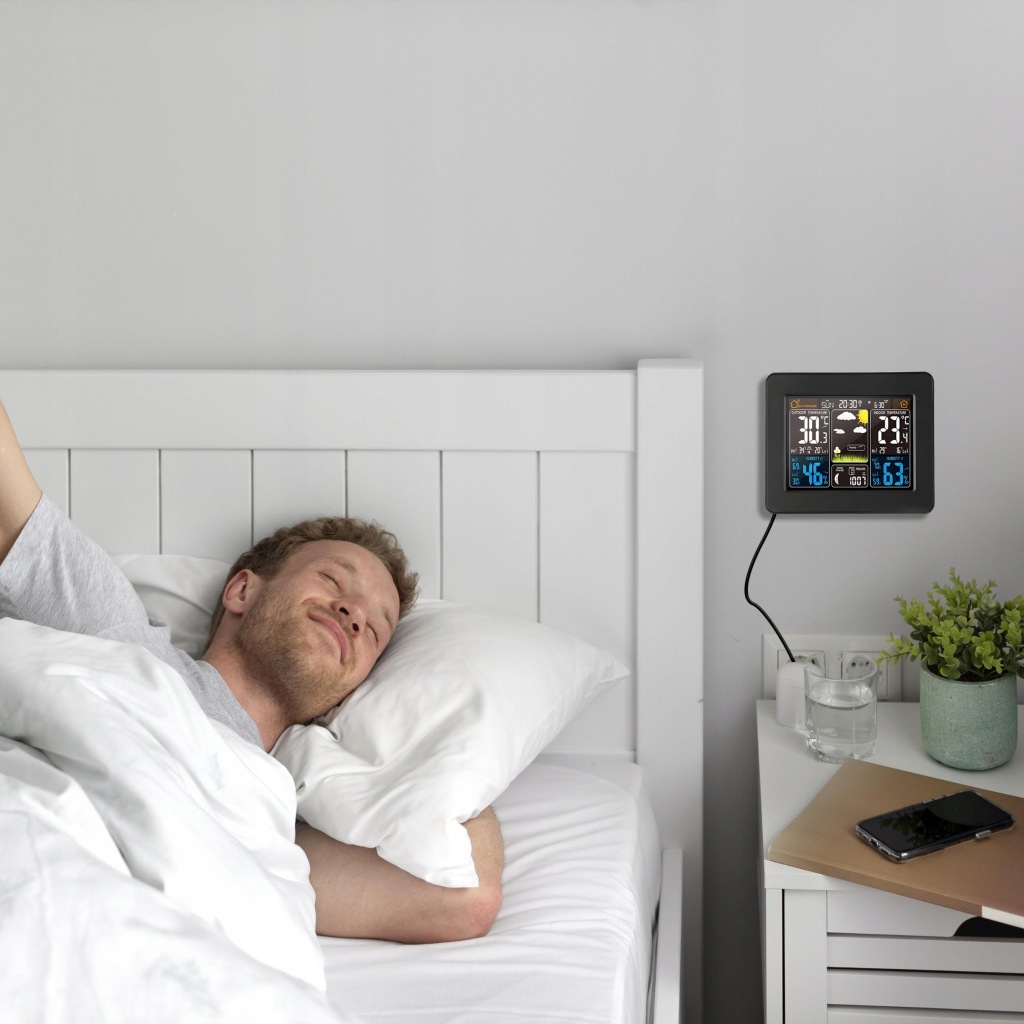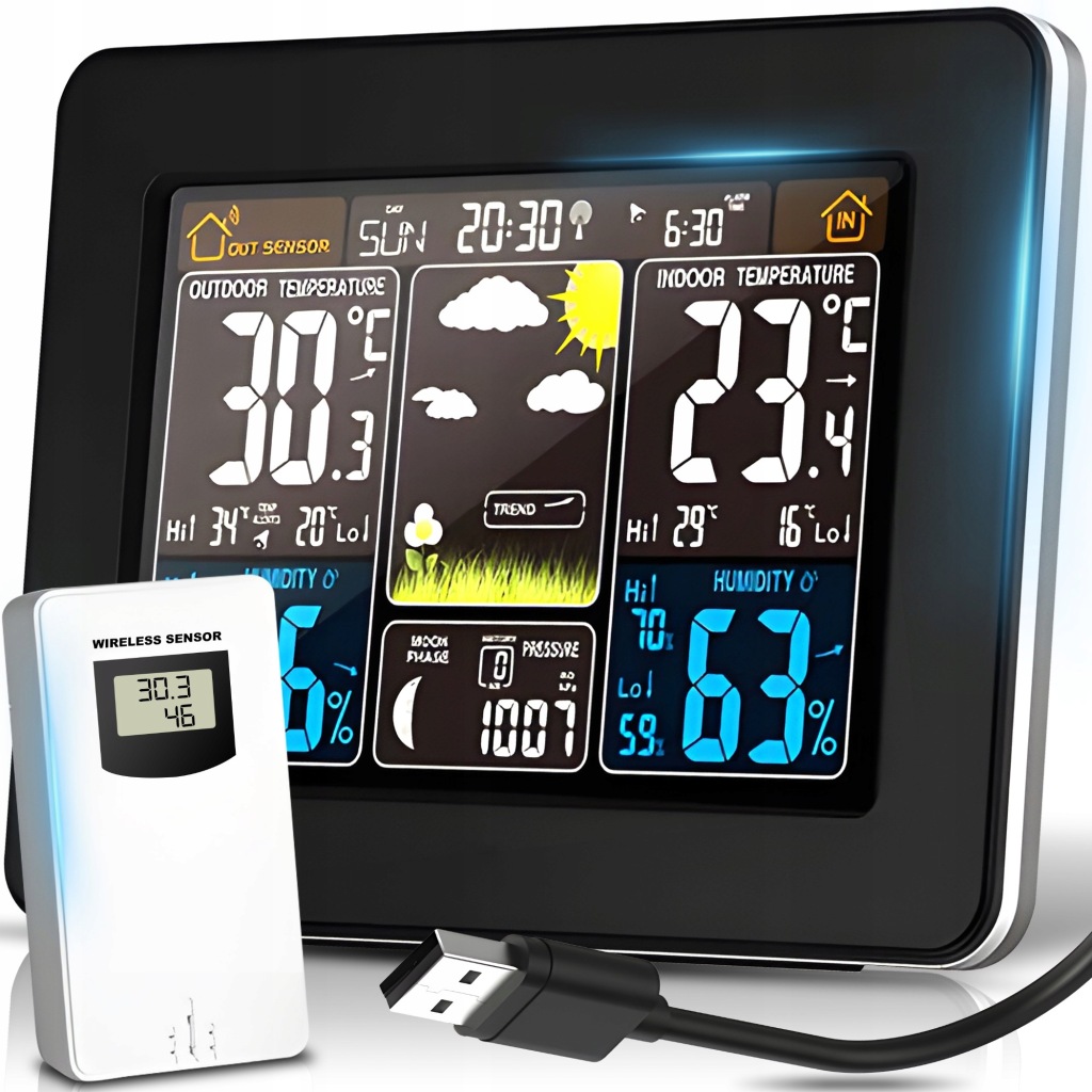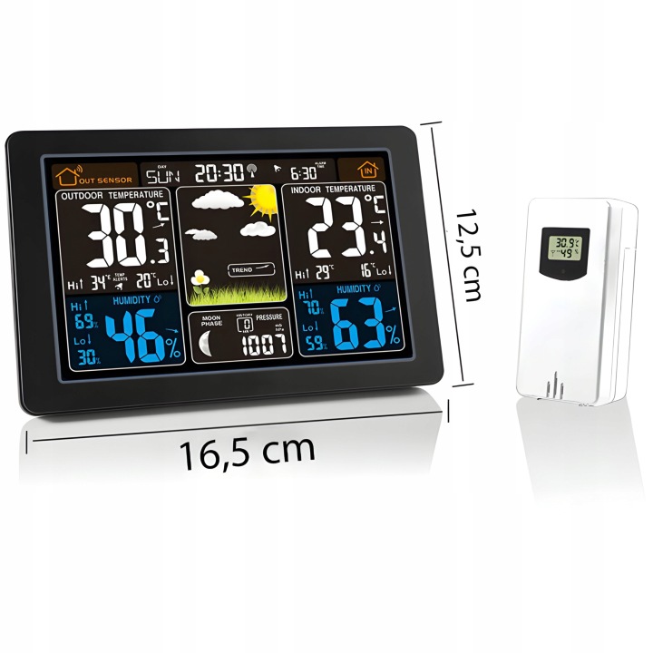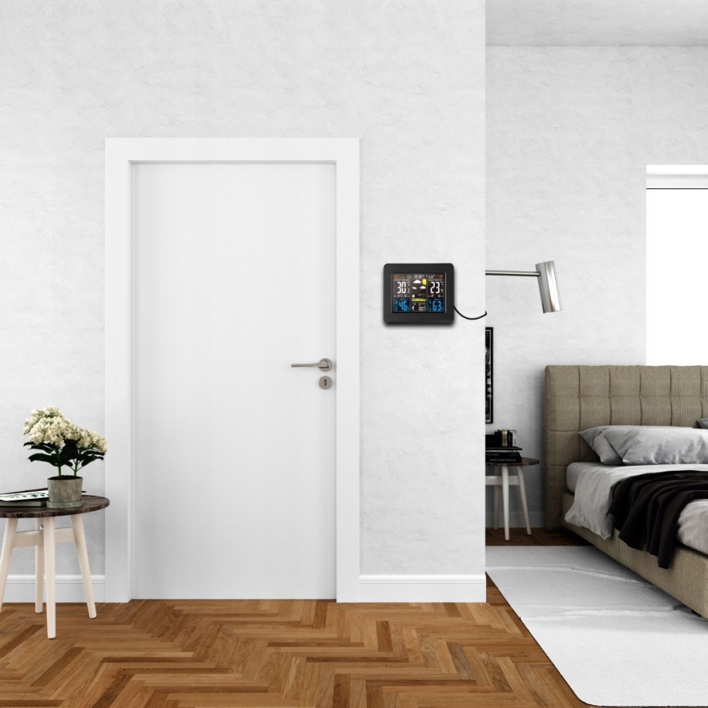 пристрій має дуже сучасний дизайн, тому воно безумовно не буде спотворити приміщення. Станція може бути встановлена безпосередньо на столі або полиці або підвішена на стіні в будь-якій кімнаті. Зовнішній датчик живиться від батарей (2X LR6 AA), а метеостанція-від батарей (2x LR6 AA) або через USB-кабель. Продукт має кольоровий, легко читається РК-дисплей, з якого дуже легко читати всі цікавлять нас значення.