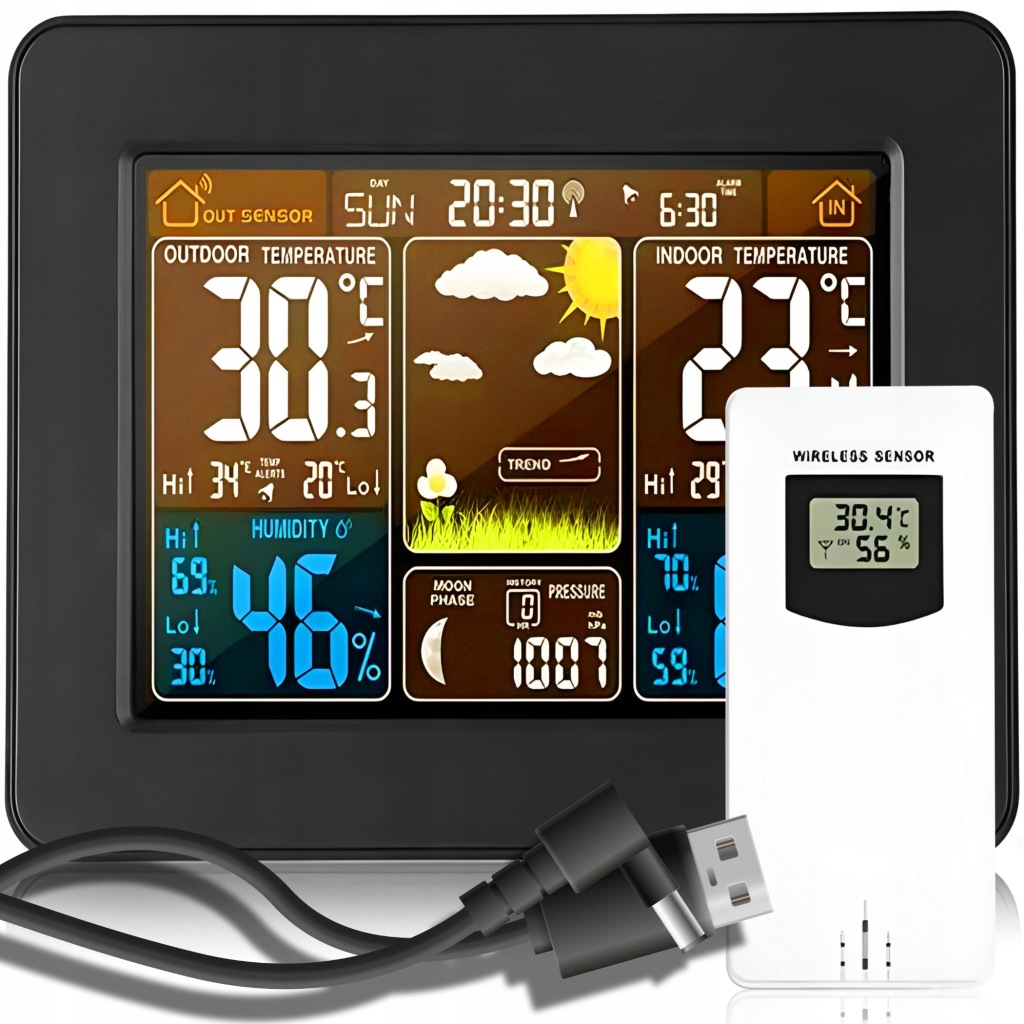 наш продукт є останньою моделлю функціональної метеостанції. Станція виконує вимірювання таких значень ,яктемпература, вологість або тиск . Пристрій має в комплекті спеціальний зовнішній датчик з діапазоном до 60 метрів, завдяки якому можна вимірювати як вдома, так і на відкритому повітрі. Наведені значення дуже точні і оновлюються на льоту.