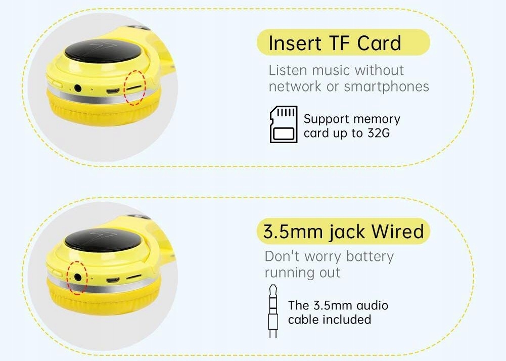 Частотна характеристика 20-20000 Гц . імпеданс 32Ω.міні-розʼєм 3,5 мм для підключення навушників через кабель в разі розряду батареї. індикатор режиму роботи. жовтий колір.