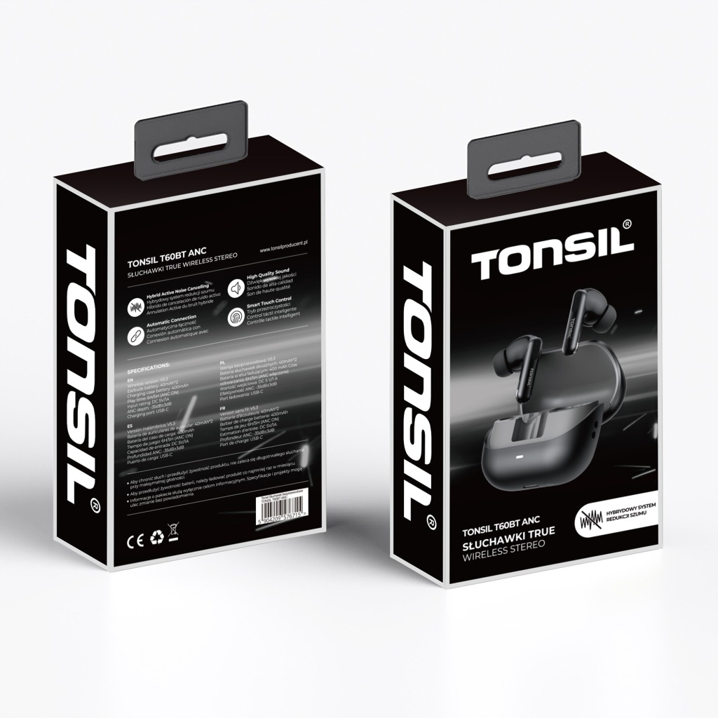 внутрішньоканальні навушникиTonsil T60 BT PRO Anc Hybrid були створені для вимогливої аудиторії. Наша мета полягала в тому, щоб вивести продукт на ринок для людей, які хочуть слухати музику в зручному вигляді з високою якістю звуку. Для зручності Користувача в навушники вбудовані сенсорні панелі, що дозволяють управляти музикою або розмовами, не витягуючи телефон з Кишинева.