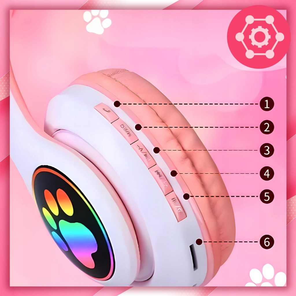 навушники оснащені дуже модною світлодіодним підсвічуванням у формі котячих вух. На навушниках є малюнок котячих лапок, також з підсвічуванням в кольорах RGB.