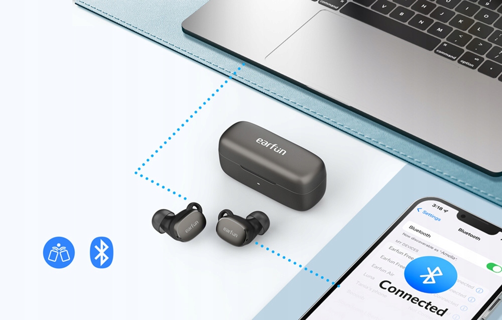 навушники EarFun створені для зручності використання, тому використовують технологію Bluetooth 5.3. Таким чином, Ви отримуєте впевненість в тому, що зʼєднання буде швидким, стабільним і без перешкод. Більш того, сполучення навушників з обраним пристроєм дуже просто і швидко. Крім того, якщо вони не підключені до будь-якого обладнання, він автоматично вимикається через 10 хвилин для економії енергії.
