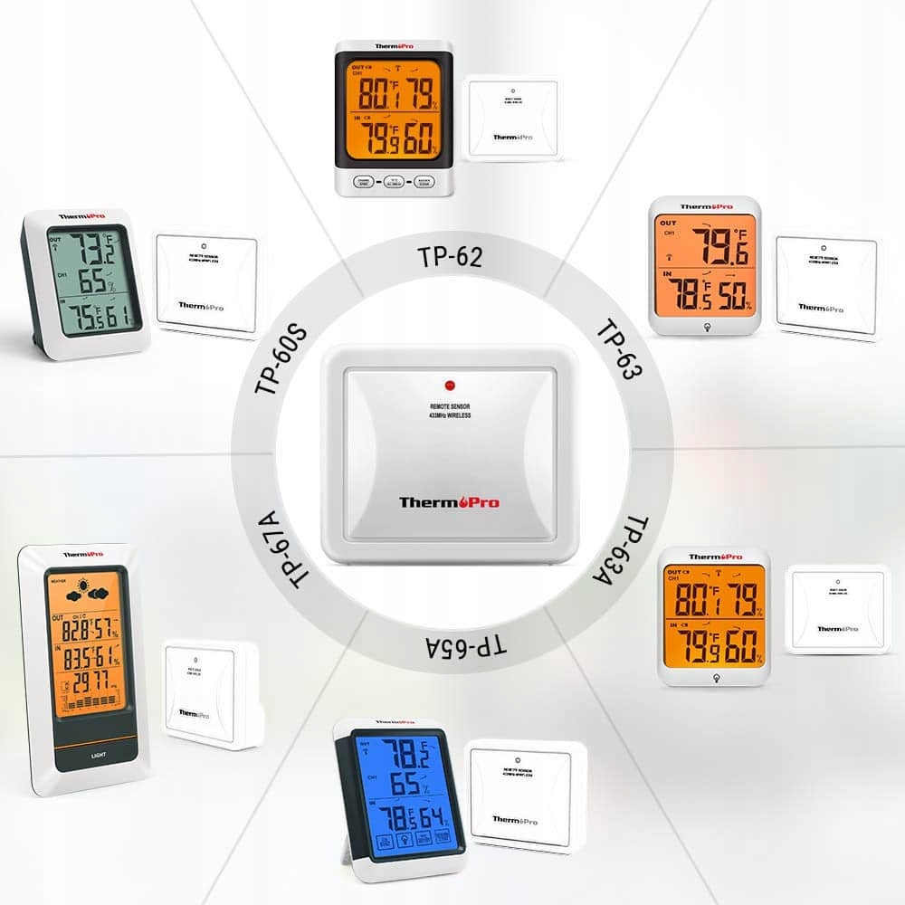 універсальний датчик сумісний з усіма зовнішніми гігрометрами ThermoPro: TP-62, tp-65 і іншими моделями, що працюють на частоті 433 МГц.