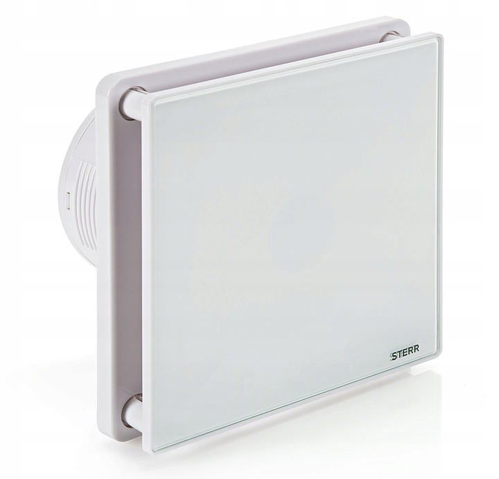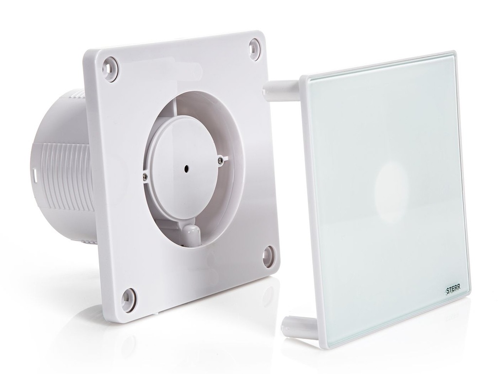 вентилятор для ванної кімнати зі скляною передньою панеллю, гігростатом і зворотним клапаном. Зі смаком і сучасний вигляд.