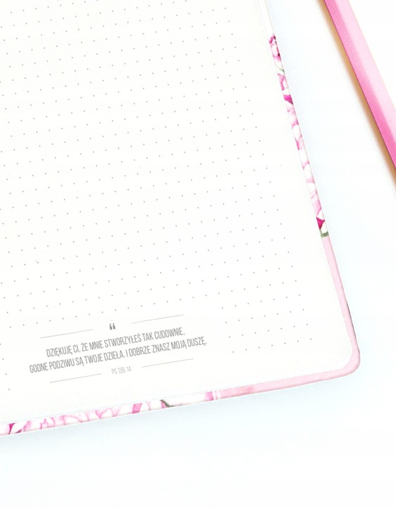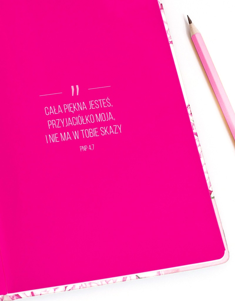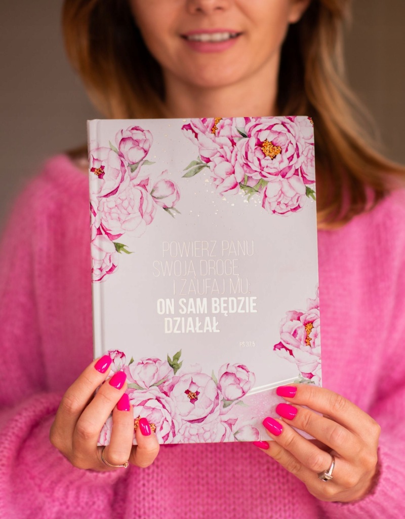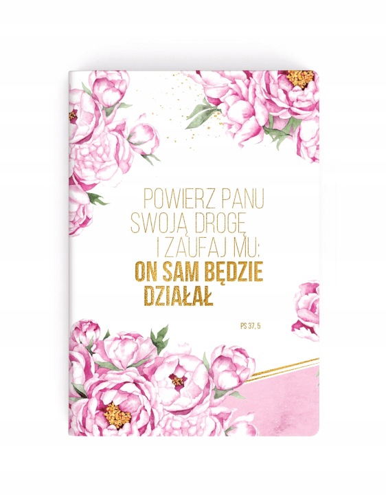 Блокнот з цитатами зі Святого Письма з красивою твердою обкладинкою з півоніями. Квіти, намальовані спеціально для захоплення талановитим ілюстратором Зосею Глазко (@zofiaoczkoilustration).на обкладинці злотими літерами вигравірувано напис-цитата з псалма 37: