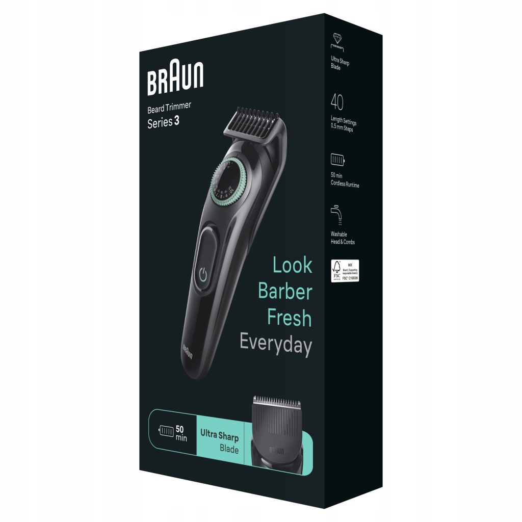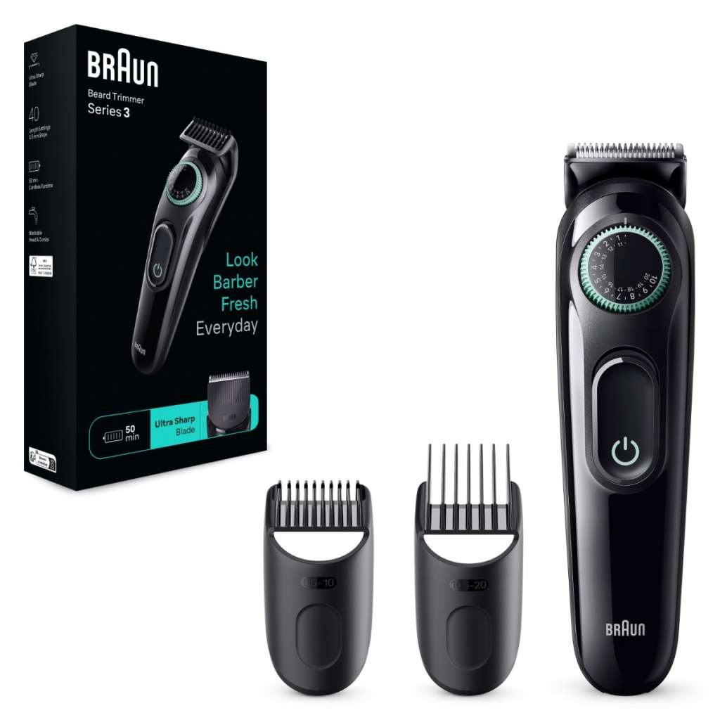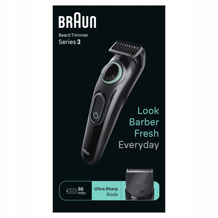 отримайте вдома результати, як у барбера, з тримером для бороди Braun Series 3. Точність в кожному штриху з ультрагострими лезами, які забезпечують рівномірність при всіх рослинах на обличчі. Колесо для точного регулювання з 40 настройками довжини.