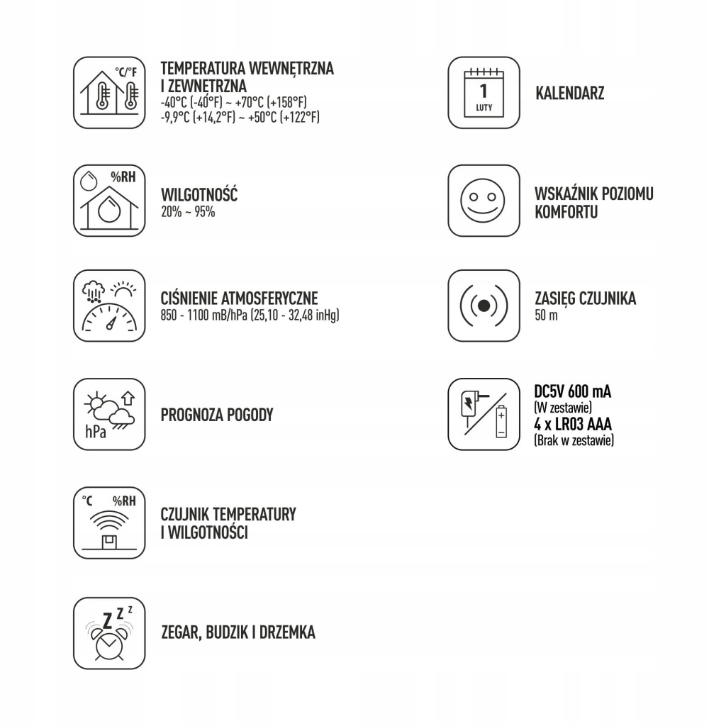 - багатофункціональна станція завдань - Вимірювання і відображення температури, вологості повітря, тиску і прогнозування погоди разом з вбудованим будильником і календарем - все це в одному практичному пристрої.Чи>