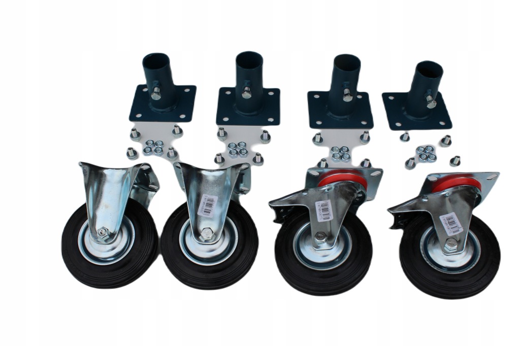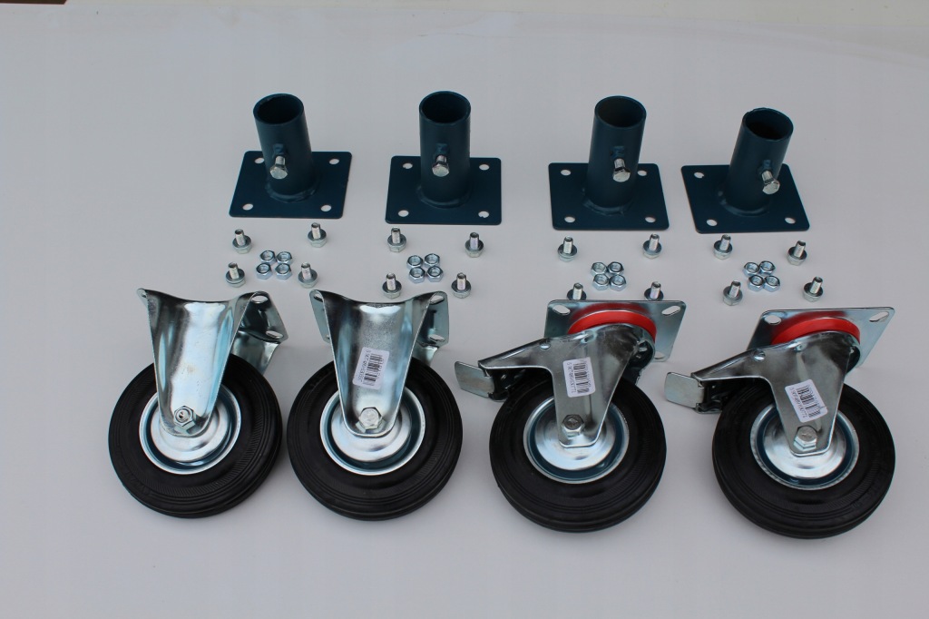 ролики для будівельних лісів діаметр fi 125 мм + трубка з зовнішнім діаметром 42,4 мм, Внутрішній діаметр трубки 37 мм.Вантажопідйомність фактичний один ролик 80 кг. ціна за комплект 4шт, два колеса з торсіонним гальмом і два фіксованих колеса без гальма.набір для самостійного скручування в комплекті з гвинтами .накладки і шайби.