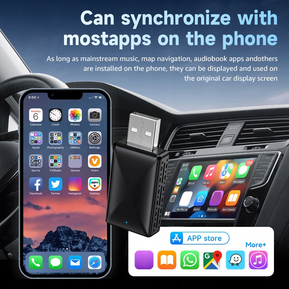 5.безпечне водіння без рук: Бездротовий адаптер CarPlay підвищує безпеку водіння, дозволяючи здійснювати телефонні дзвінки без допомоги рук, перевіряти голосову пошту, читати текстові повідомлення і переглядати карти. Слухайте улюблені пісні з iTunes, Apple Music або встановлених додатків, не відриваючи рук від керма.