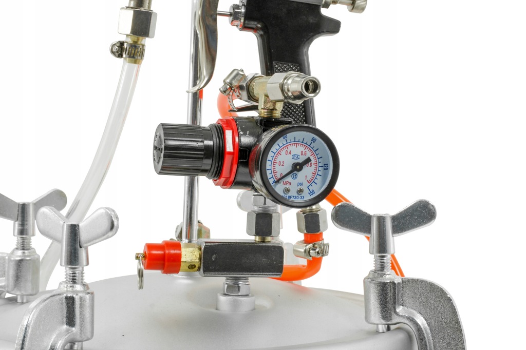 пневматичний краскопульт, який використовується в поєднанні з малярським баком. Набір характеризується дуже хорошими параметрами розпилення і високою швидкістю фарбування. Система розпилення дозволяє використовувати велику кількість фарби, яку можна швидко наносити, заощаджуючи при цьому час і гроші. Гладка сталева посудина під тиском з високою корозійною стійкістю. агрегатом можна наносити практично всі фарби і лаки, клеї, емульсії, морилки, антикорозійні фарби, шпалери спрей.