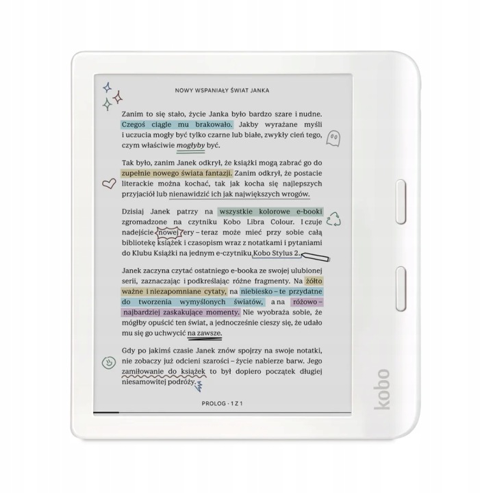 представляємо нашого самого надихаючого читача: новий Kobo Libra Color. Заповніть магію полів книг, додавши нотатки, упорядкувавши думки та виділивши надихаючі цитати – тепер барвисто. Пориньте у свої улюблені історії, відзначаючи важливі моменти та виділяючи важливі цитати за допомогою сумісного стилуса Kobo Stylus 2.