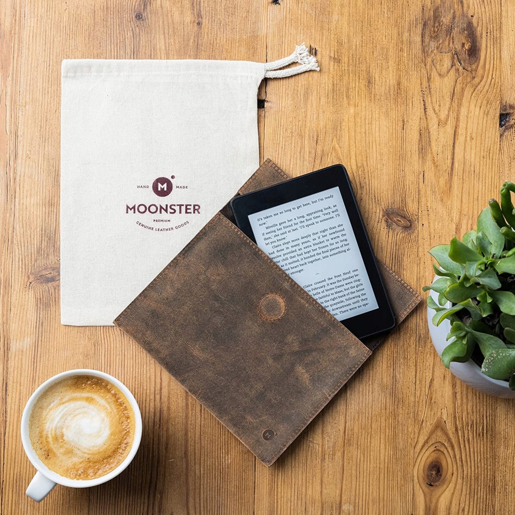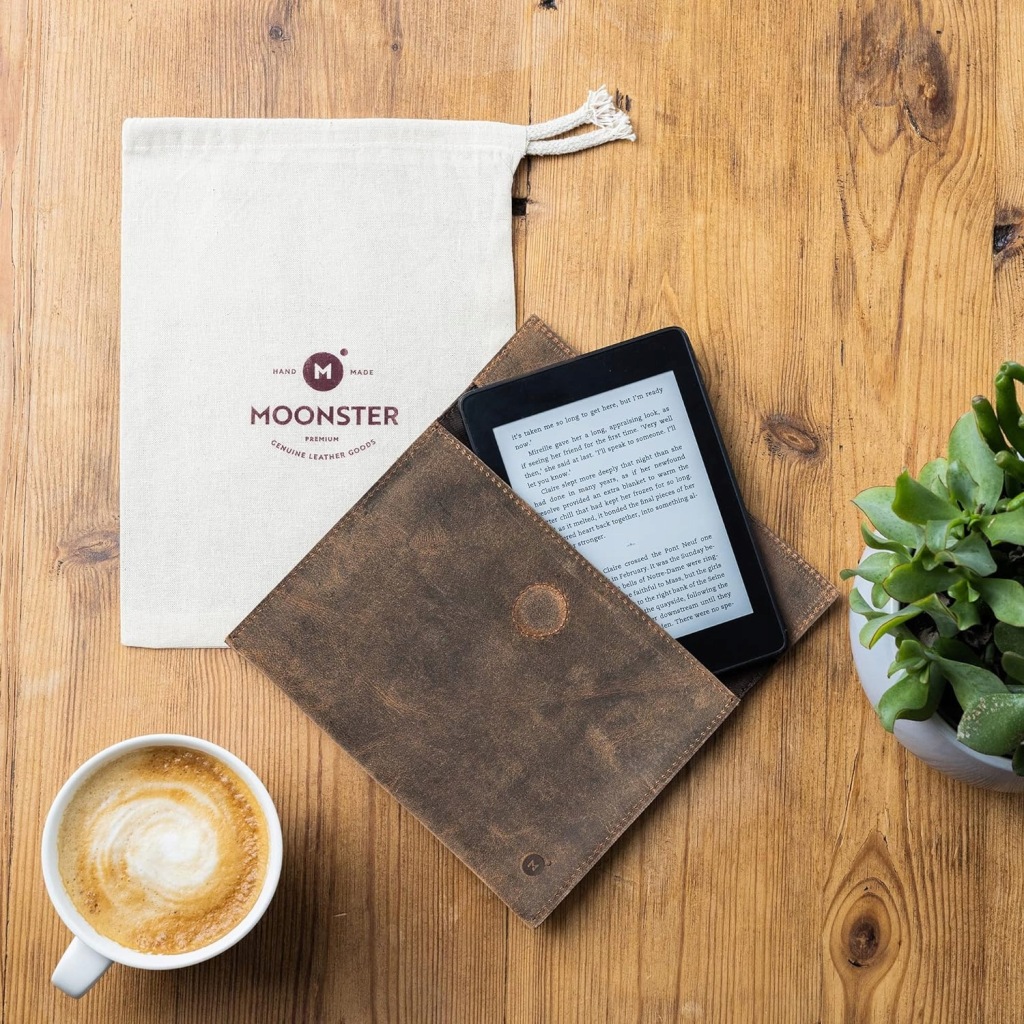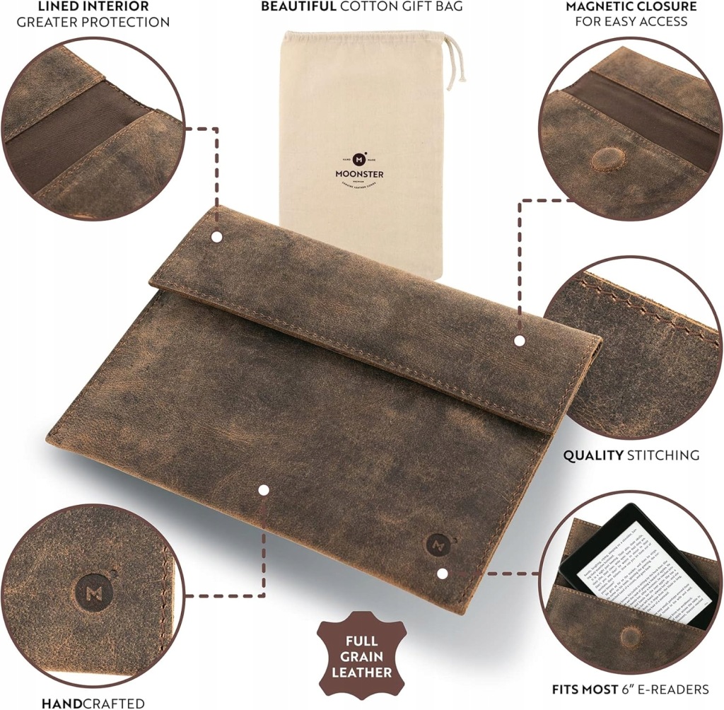 - натуральна шкіра: шкіряний чохол для читання Moonster виготовлений вручну з 100% натуральної шкіри буйвола для міцності, довговічності і виняткової краси. Виріб ручної роботи в Індії. Чохол природно засмаглий для унікального, автентичного вигляду і має унікальний колір і відтінок.