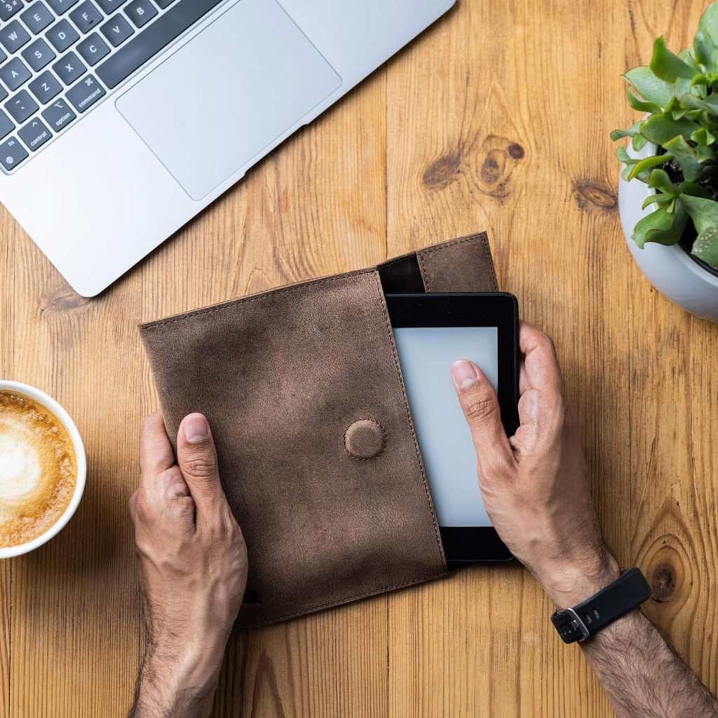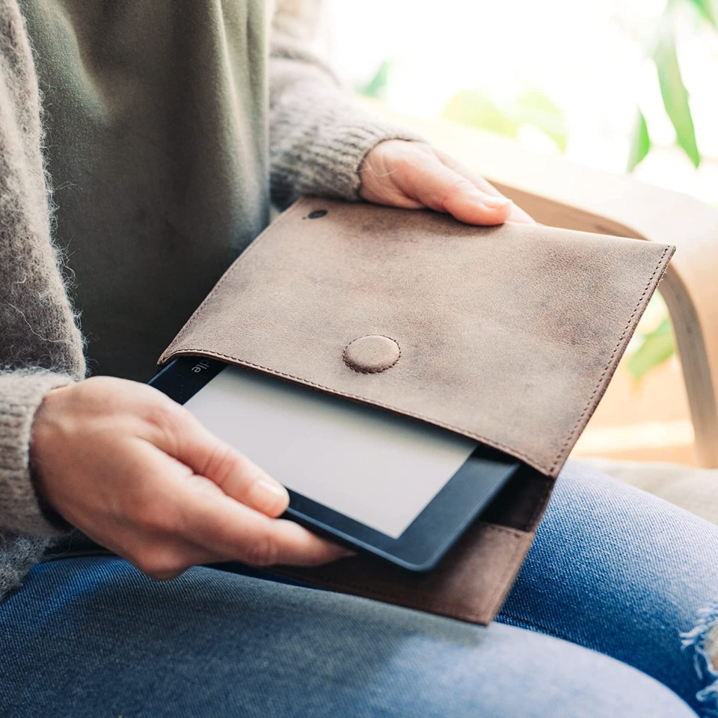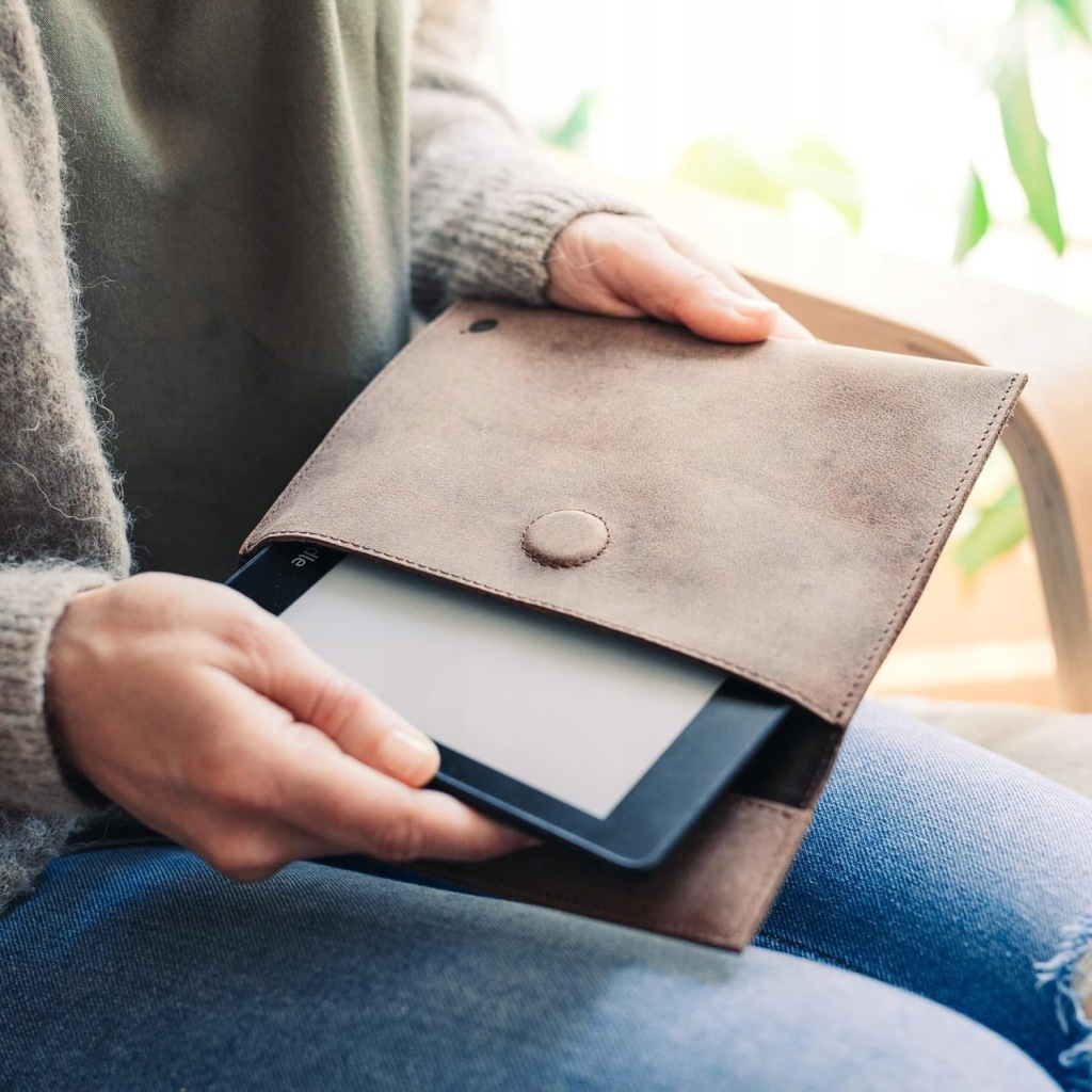 - якщо ви знаходитесь в дорозі, в улюбленому кафе, або вдома, наш розкішний шкіряний чохол зробить Ваш час читання особливим. З сільською, структурованою обробкою та позачасовим виглядом вам сподобається витягувати наш футляр для читання електронних книг із сумки та втрачати себе у своїх улюблених історіях. Це вишуканий, продуманий подарунок для друзів, родини та близьких – ідеально підходить для завзятих читачів, мандрівників та новоспечених випускників!