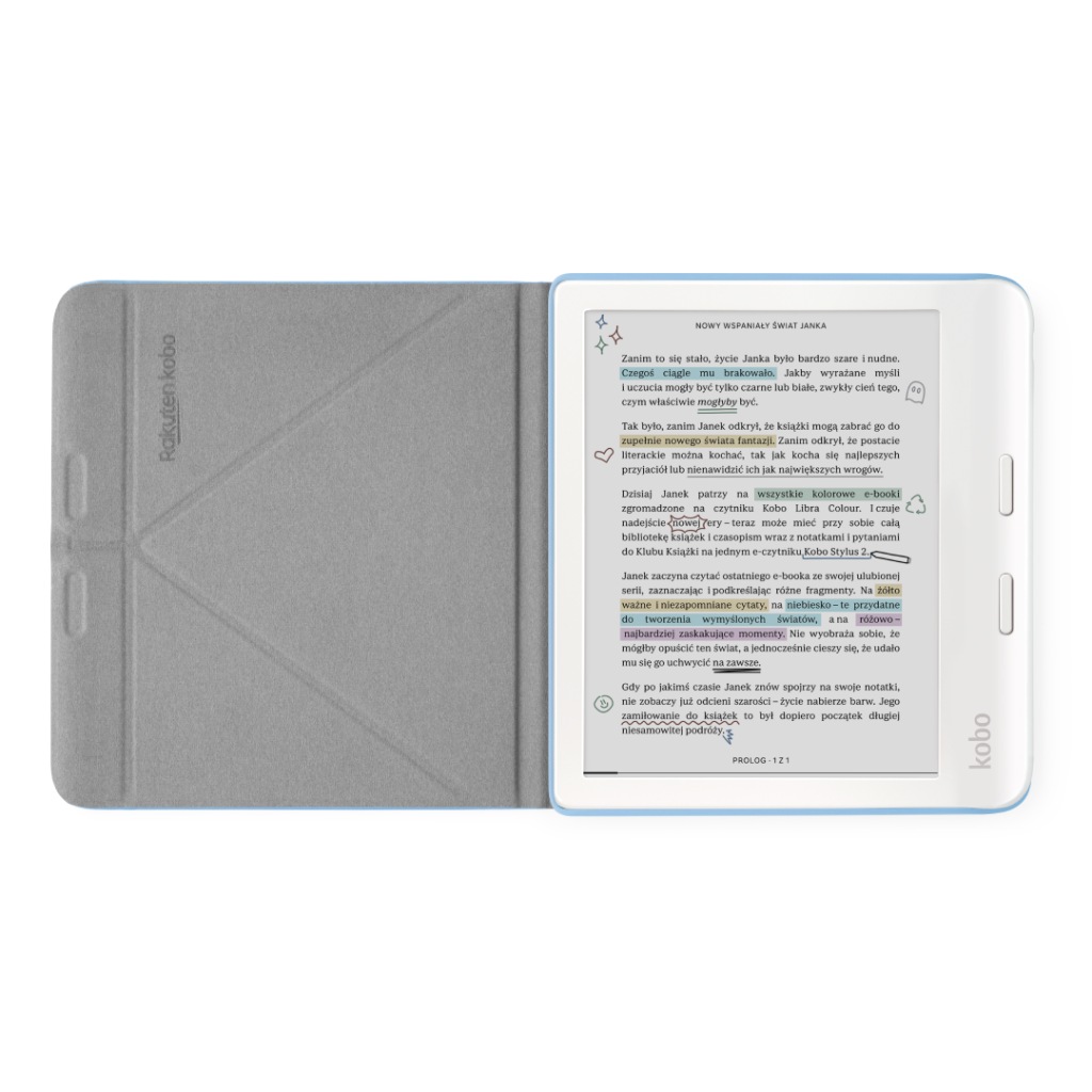 дзіęки чохол Kobo ваги колір SleepCover możesz zabrać swóJ читач в КАżde місце, персоналізованийć його і подбаєć про його видąD. SleepCover чохол бувłпро призначений для супроводуć ви на каżдим крок, і дзіęки вбудованої підставці моżesz поставитьć рідер у вертикальному і горизонтальному положенні. Kobo Libra Color автоматично прокидається si & # x119; при відкритті футляра і знову засинає після його закриття & # x119;ciu.
