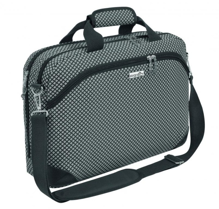 Виготовлена з міцного, водонепроникного матеріалу чорного кольору з сірим принтом квадратів.