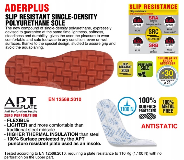 вставка: ЕВАНІТ, виготовлений зі спеціального зʼєднання EVA і нітрилу, з високою вантажопідйомністю і змінною товщиною (12 мм - 7 мм - 3 мм). Термоформований, анатомічний, перфорований і покритий дуже дихаючою тканиною. Антистатичний завдяки спеціальній обробці на поверхні і швах з провідних ниток