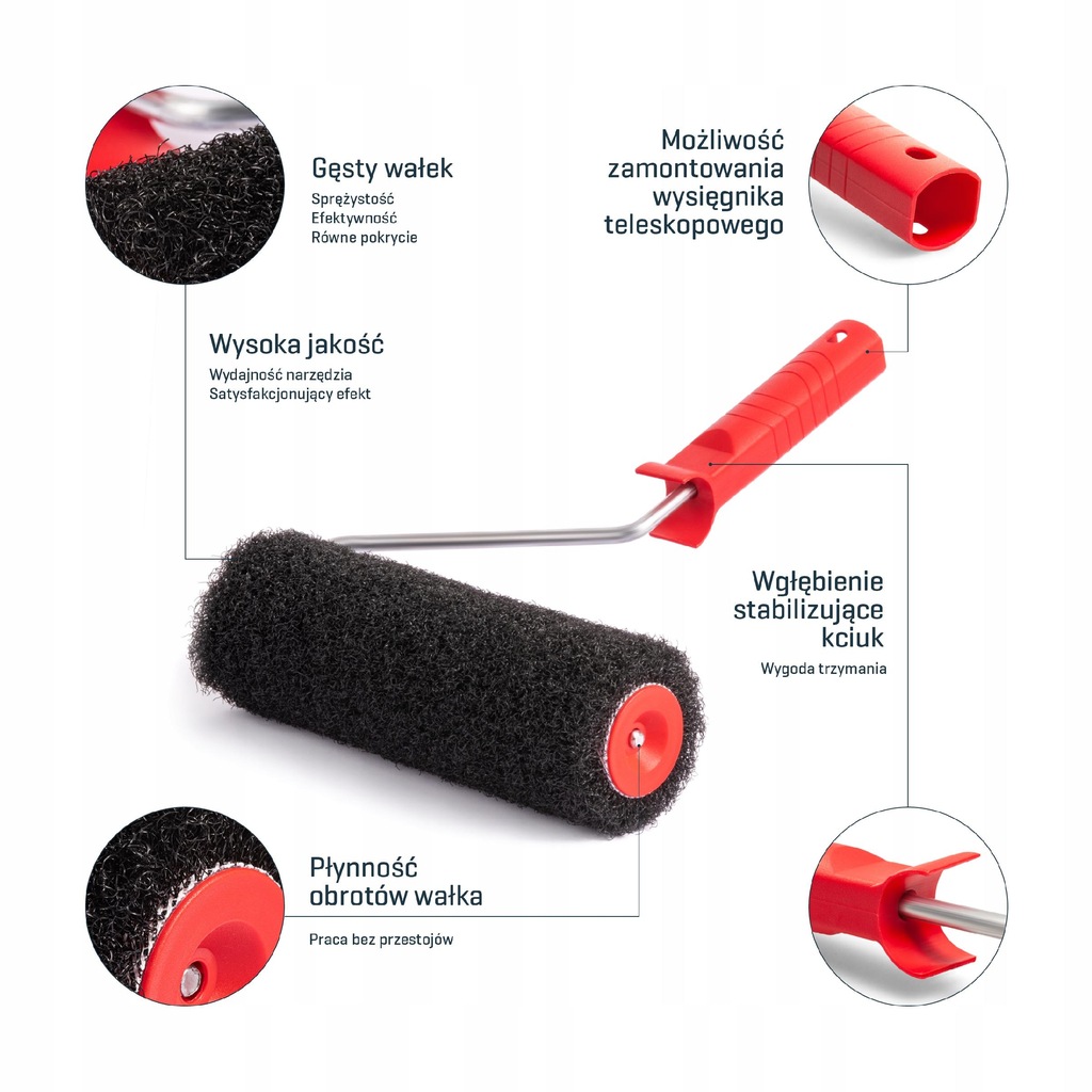 довгий валик для шпаклівки , що дозволяє швидко і рівномірно розподілити шпаклівку по стіні або стелі. Він стабільно тримається на металевій ручці і плавно обертається навколо своєї осі без заїкань і простоїв.