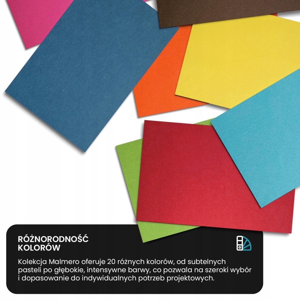 Malmero - це високоякісний папір, який вражає своєю гамою інтенсивних, вишуканих кольорів і гладкою поверхнею. Це ідеальний вибір для проектів, які вимагають виняткової естетики та довговічності, таких як розкішна упаковка, елегантні запрошення або професійні брошури.