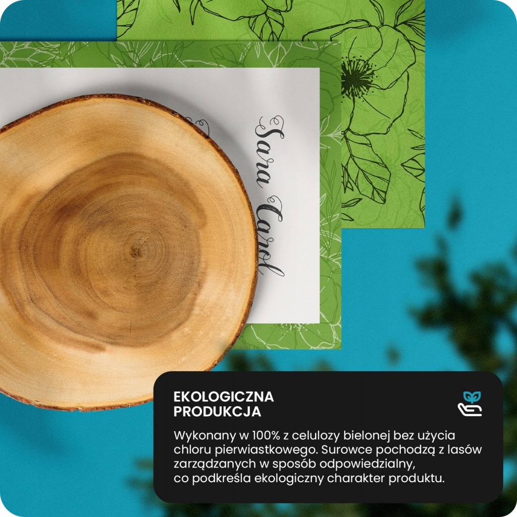 виготовлений з 100% вибіленої целюлози без використання елементарного хлору. Сировина надходить з лісів, керованих відповідально, що підкреслює екологічний характер продукту.