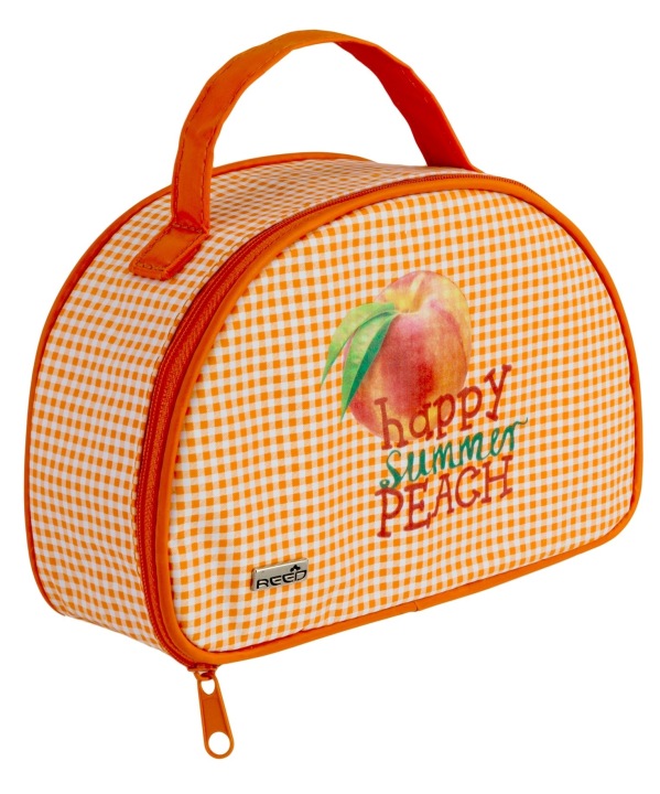 Виготовлена з водонепроникного матеріалу кольору біло-помаранчевої шахівниці .