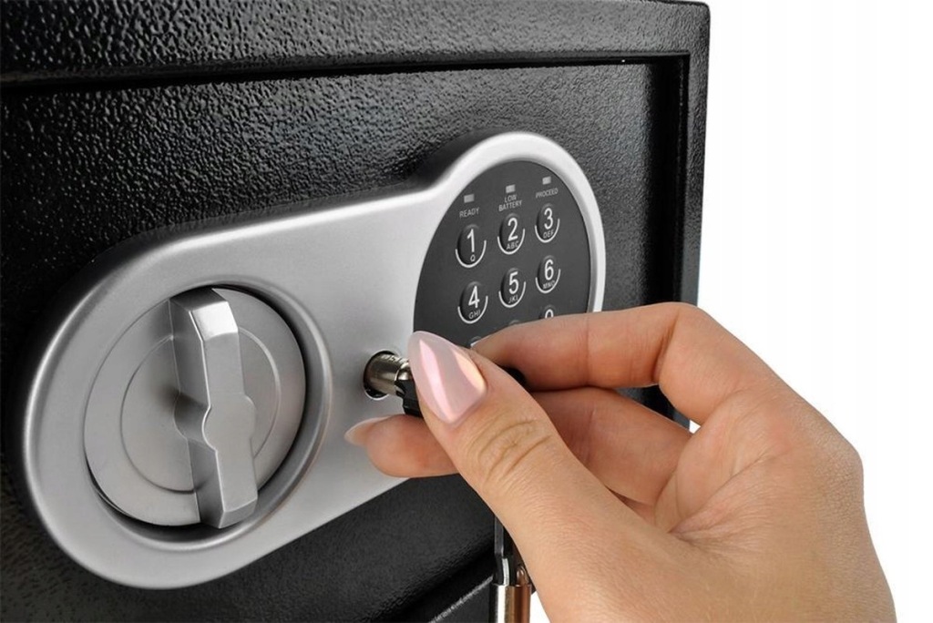 сейф можна відкрити за допомогою електронного замка або ключа.
