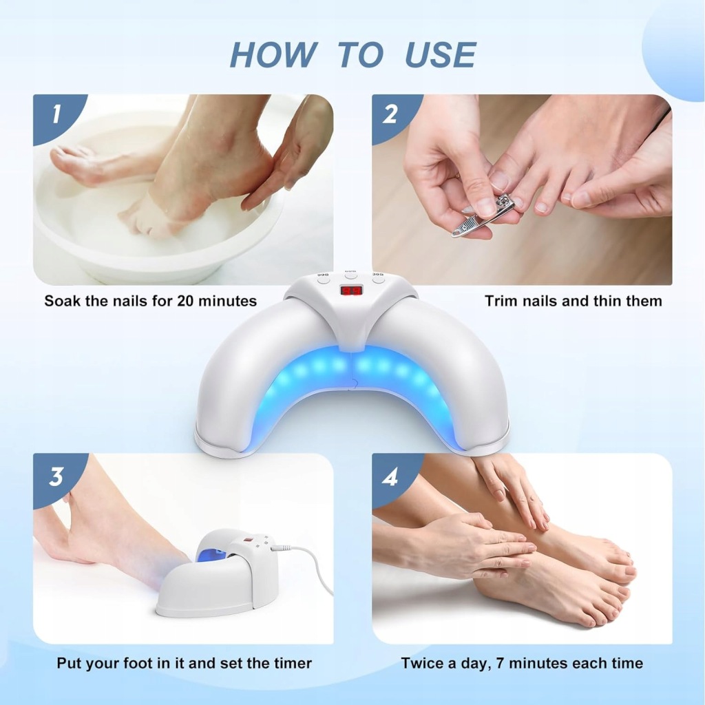 пристрій розроблений, щоб бути зручним і простим у використанні. Його можна легко і безпечно використовувати вдома. Перед використанням очистіть руки або ноги і обріжте нігті до потрібної довжини. Помістіть пальці рук або ніг у щілину пристрою лазерної терапії та виберіть потрібний час процедури. Пристрій почне відлік часу. Ви також можете слідувати інструкціям, щоб забезпечити легку та зручну роботу!