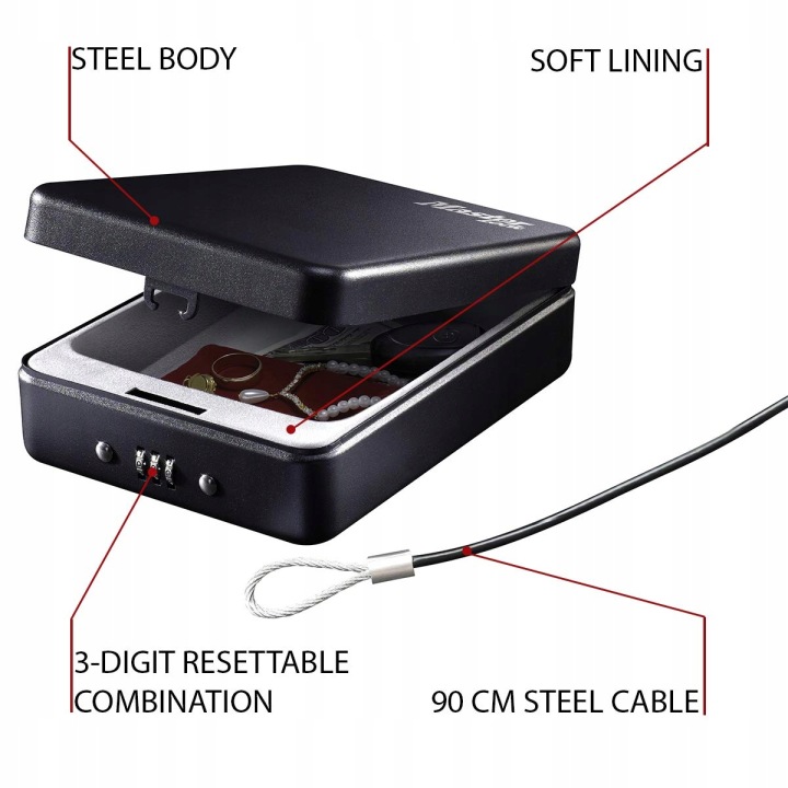у ньому є регульований 3-значний кодовий замок (1000 варіантів). Він також включає в себе вбудований сталевий трос Ø4 мм довжиною 900 мм для кріплення до фіксованої точки. Дно ящика облицьовано мʼякою піною.