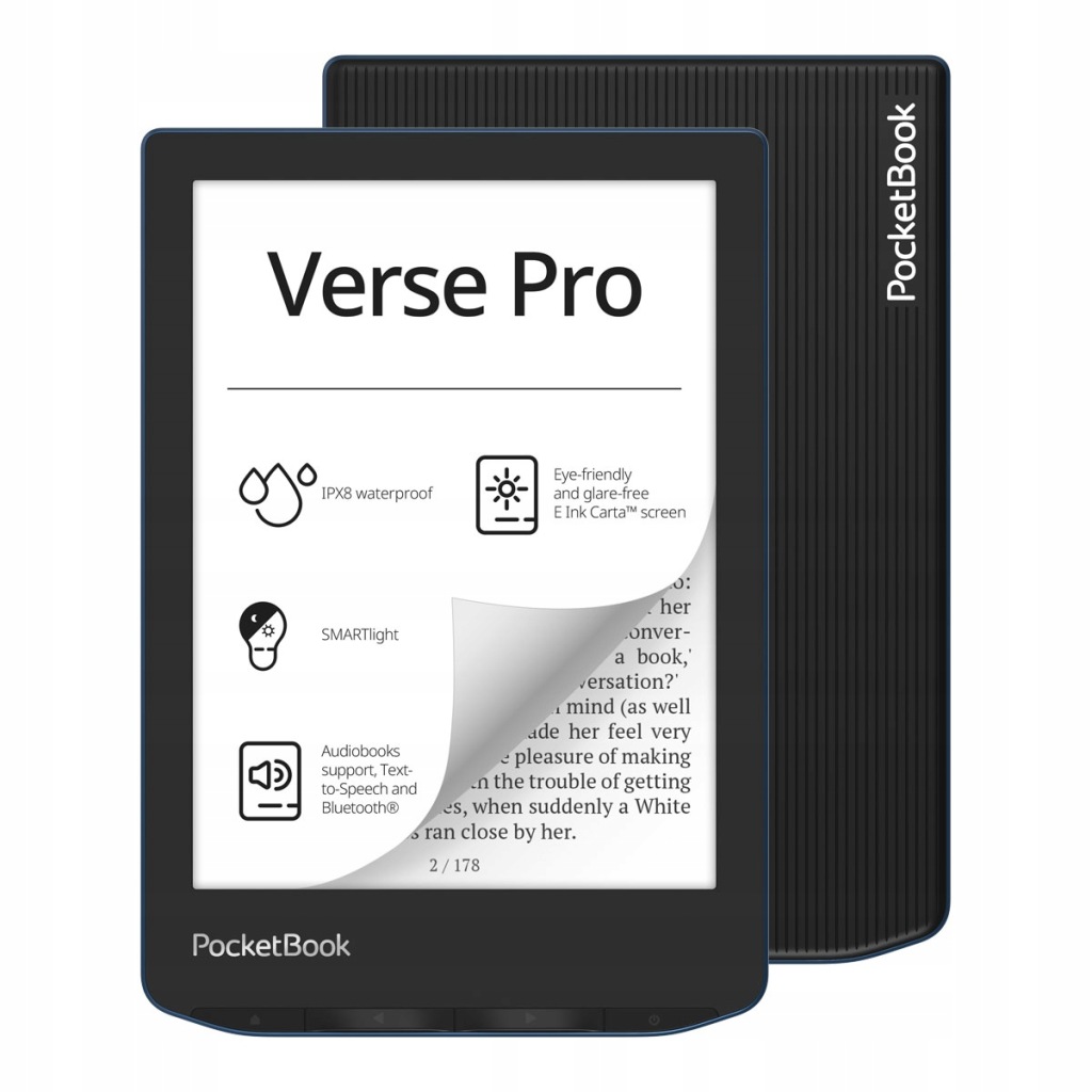 PocketBook Verse Pro має більшу внутрішню памʼять, ніж базова версія, і екран з високою роздільною здатністю . Підтримує аудіо та підключення Bluetooth.
