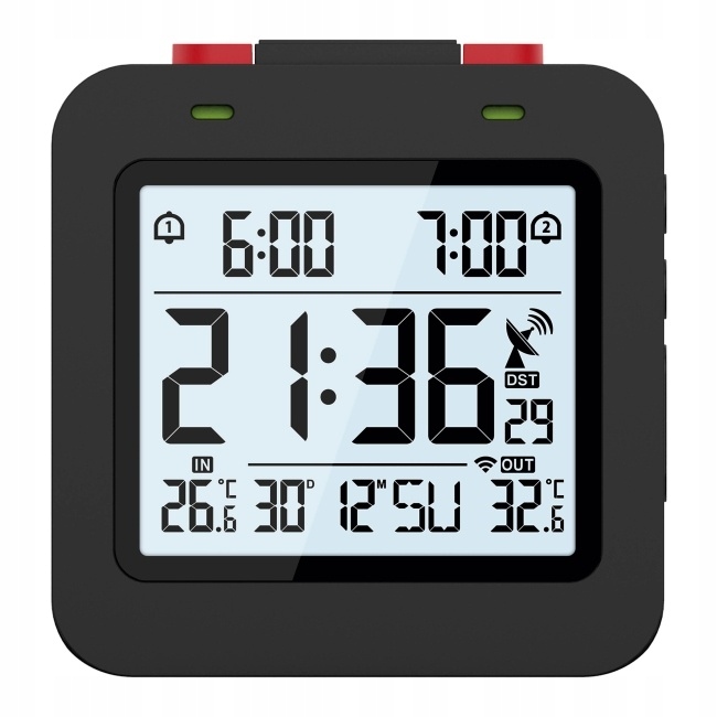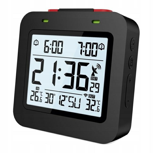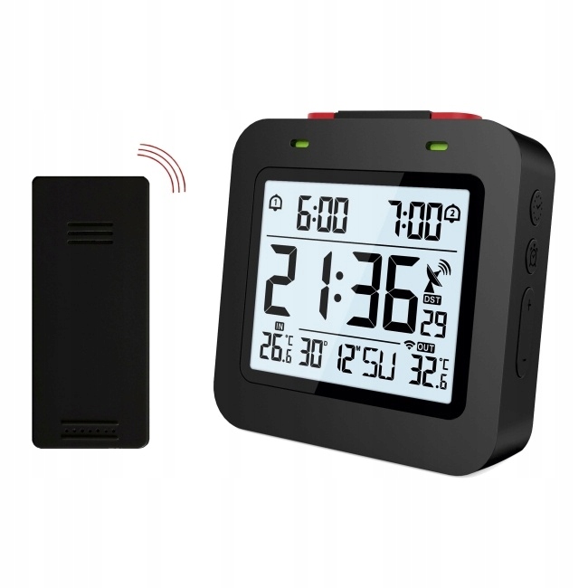 бездротовий електронний термометр оснащений:2 незалежними будильниками, годинами і календарем,контрольованими DCF, днями тижня, бездротовим вимірюванням температури зовнішнього повітря, РК-підсвічуванням