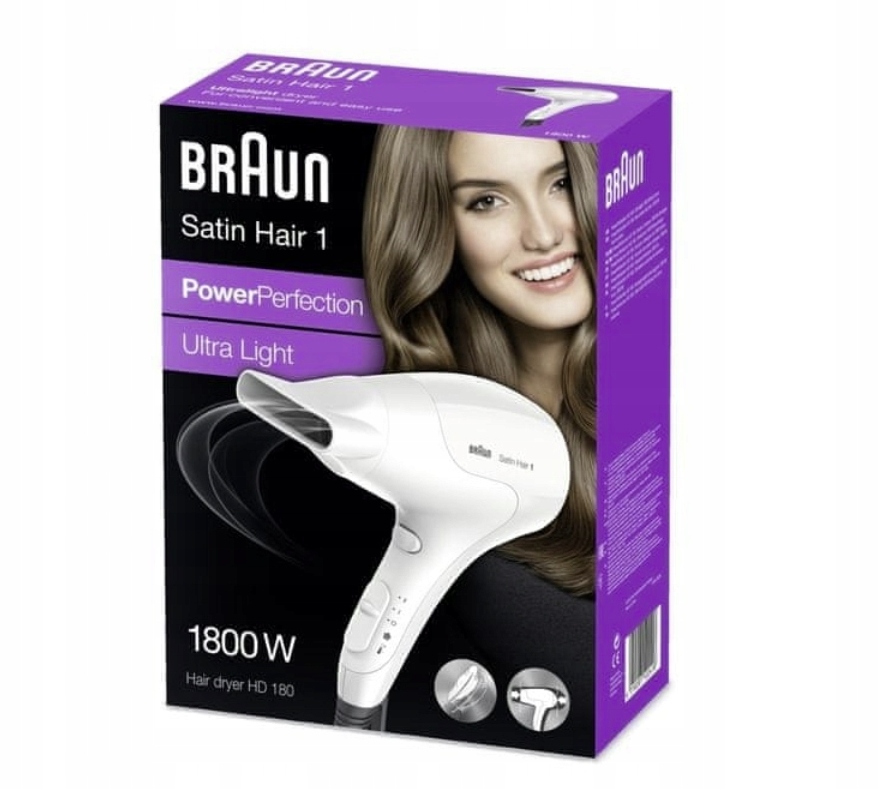 Braun HD 180 PowerPerfection-це відмінна сушарка потужністю 1800 Вт, оснащена спеціальним вентилятором для рівномірного розподілу тепла. Сушарка має вентиляцію холодного повітря, дві швидкості продувки і два діапазони регулювання температури.
