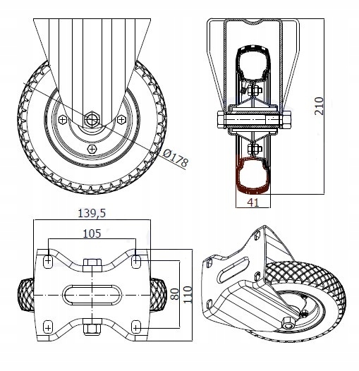 колесо з внутрішньою трубкою fi 175mm у фіксованому корпусі має сталевий обід, оцинкований і скручений на 4 болта.