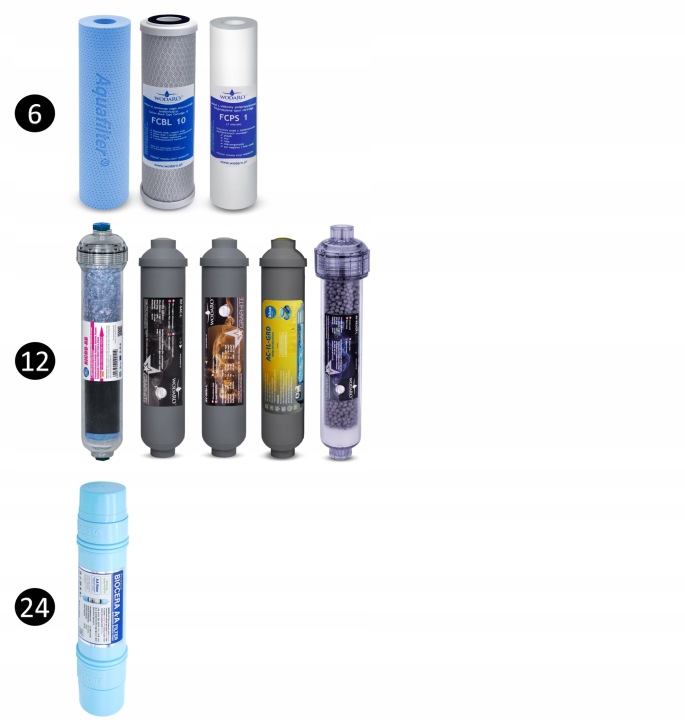- кожні 12 місяців використання картриджі: FCPS5-AB, FCBL10, FCPS1, aicro-AB, AV-GAC-L, AV-MIN-L, AC-IL-GRD, AV-REDOX-L