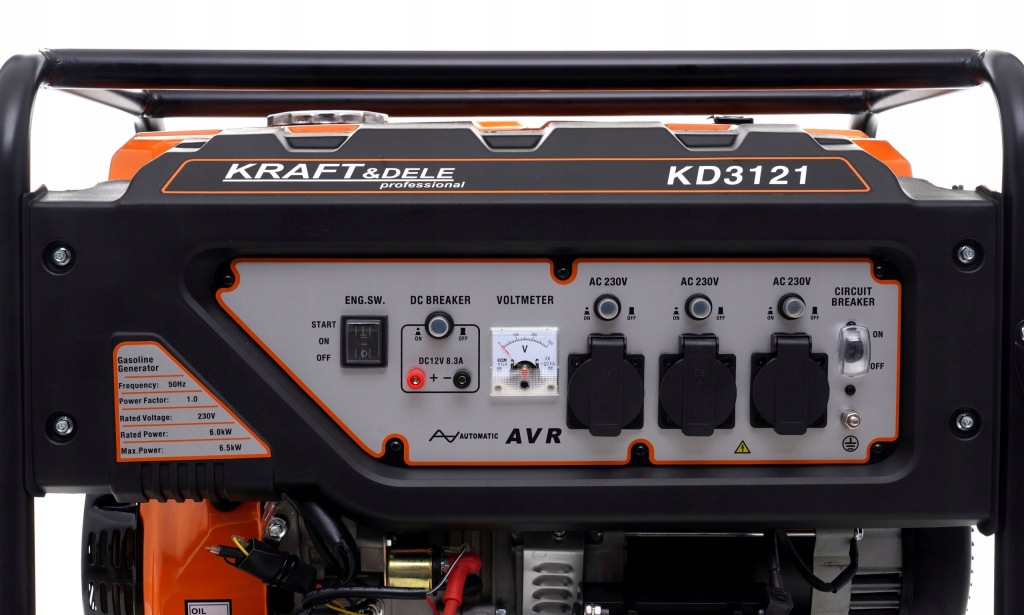 агрегат Kraft&dele серії Professional™ kd3121 ідеально підходить для будівельних майданчиків, будинків, дач, кемпінгів і скрізь, де потрібне надійне і надійне джерело живлення. Економічний і довговічний хромований поршневий двигун відрізняється безшумною і рівною роботою, а додаткове демпфірування вібрації і шумозаглушення забезпечуються гумовими стабілізаторами поперечної стійкості і подушками двигуна. Комфорт використання агрегату збільшують гумові колеса, що полегшують його переміщення.