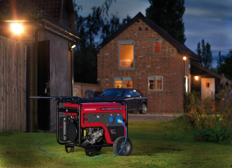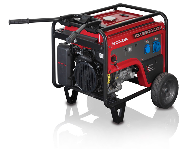 однофазний генератор Honda Модель EM5500CXS характеризуються: інтелектуальний автоматичний регулятор напруги-так званий і-AVR, двигун нового покоління iGX390, електричний стартер, режим роботи Економ-Економ, v-амортизатори, збільшений паливний бак з індикатором рівня палива.