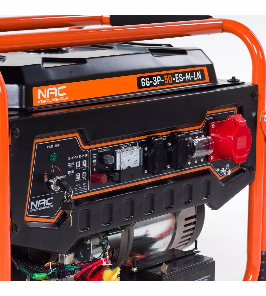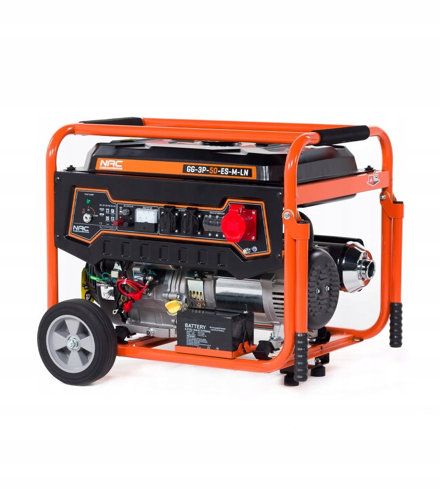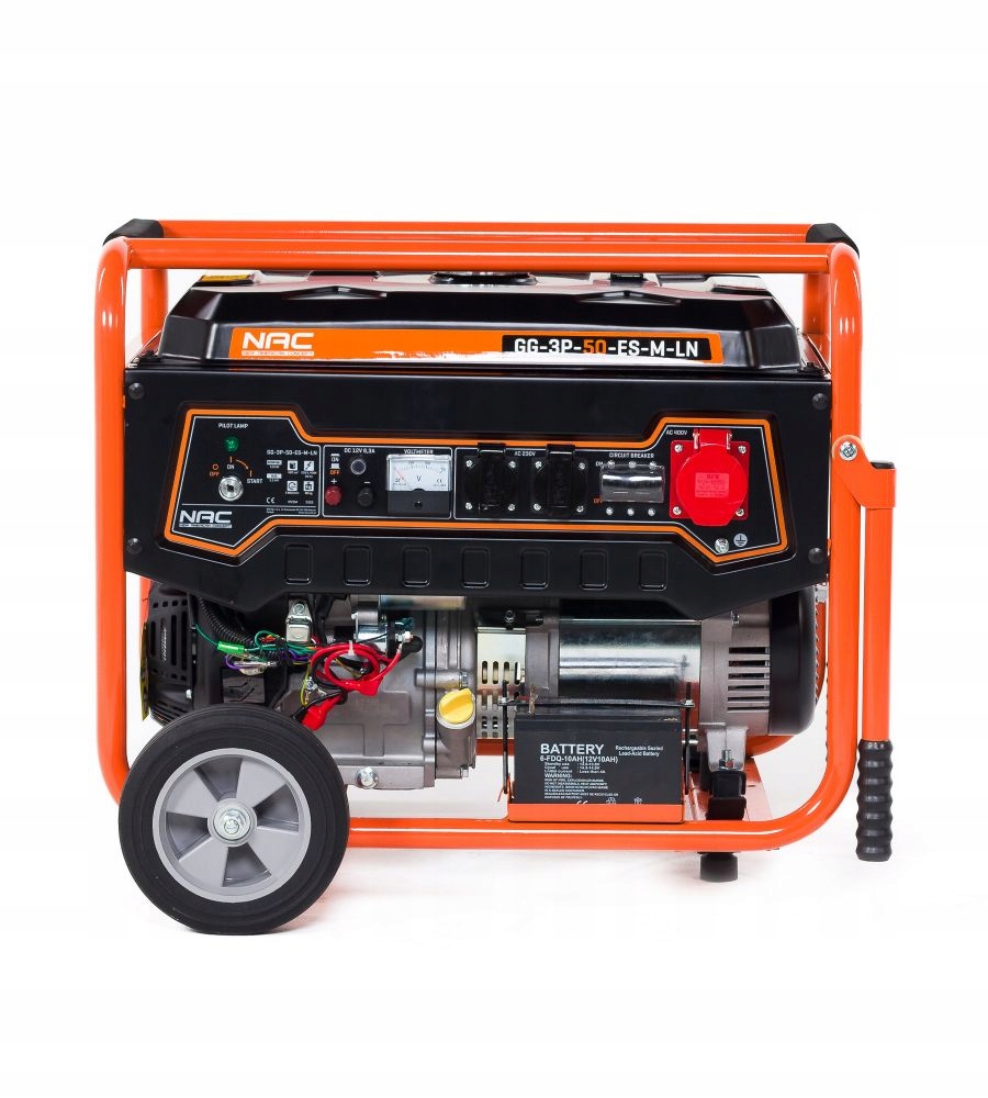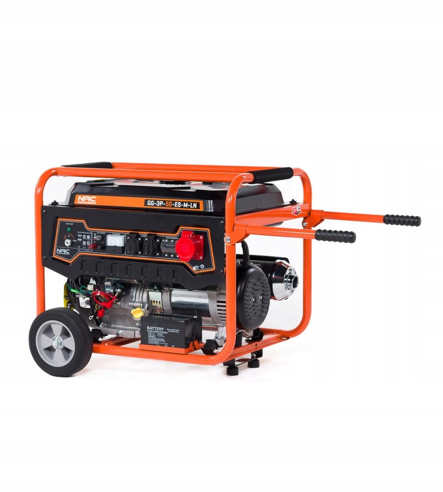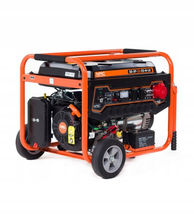 портативний трифазний генератор NAC GG-3P-50-ES-m-ln з максимальною потужністю 5500 Вт призначений для генерації змінного струму і живлення електричних приймачів напругою 230 В і 400 В, де немає інших джерел електроенергії, а також для аварійної роботи при збої електромережі.