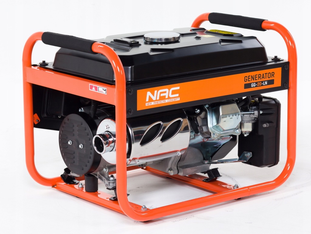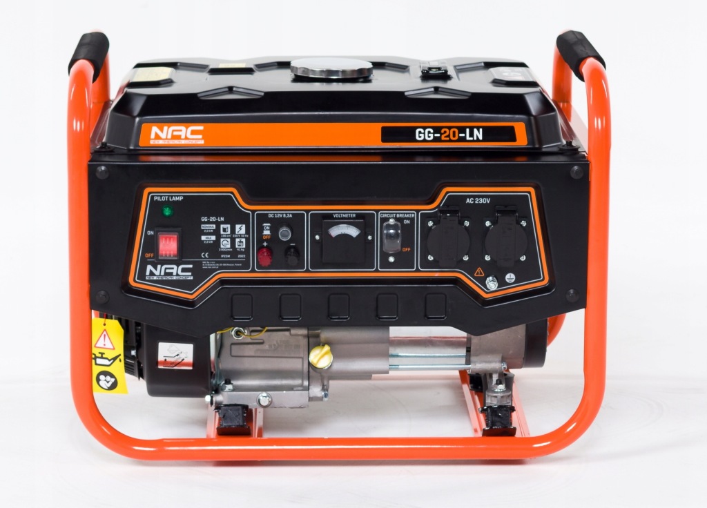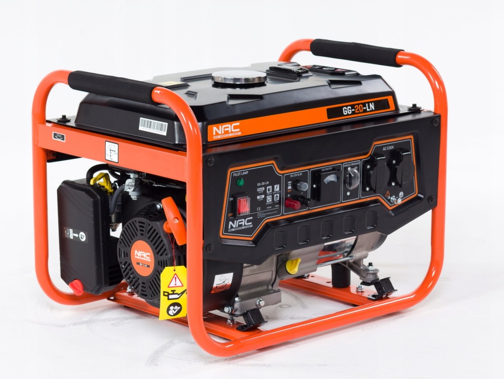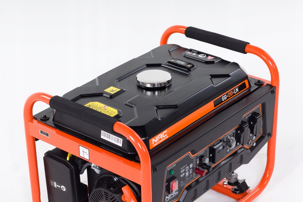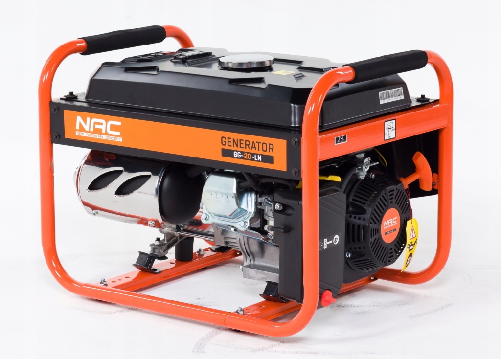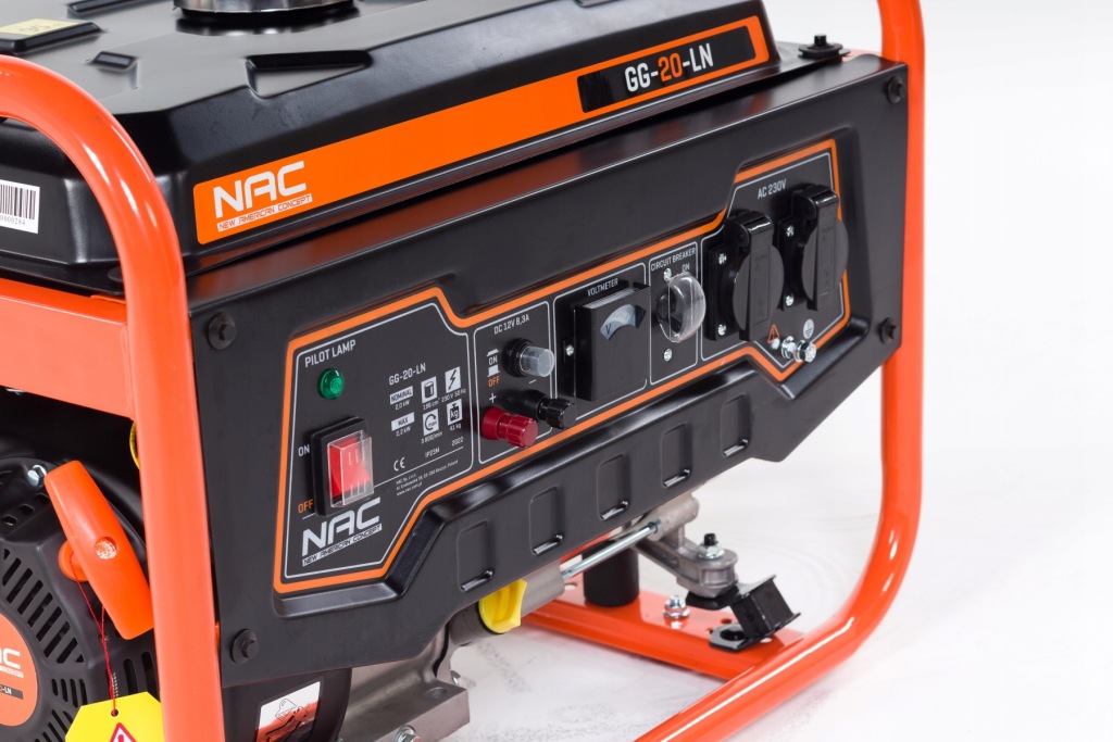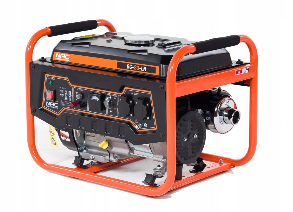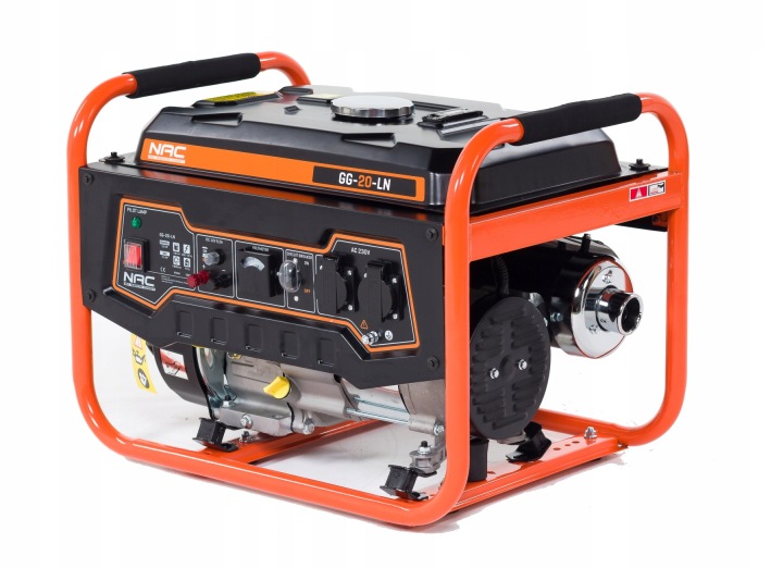 портативний однофазний генератор NAC GG-20-L з максимальною потужністю 2200 Вт призначений для генерації змінного струму і живлення електричних приймачів напругою 230 В скрізь, де немає інших джерел електроенергії, а також для аварійної роботи при збої електромережі.