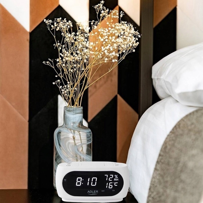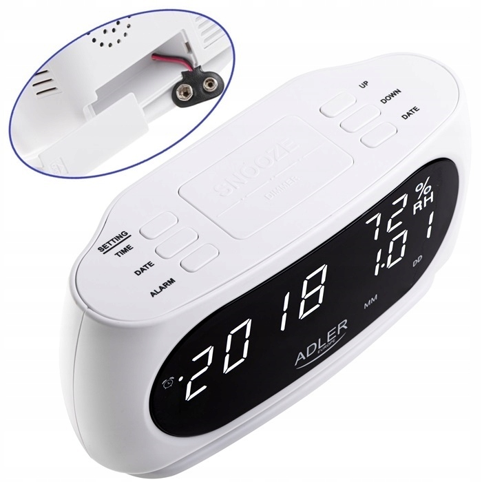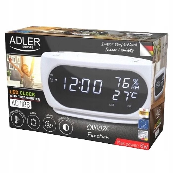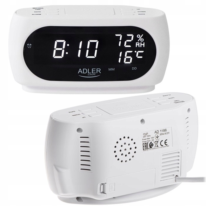 естетичний і функціональний годинник-будильник ad1186 маркиADLER . Він має функції будильника і повтору, а також вимірювання температури і вологості всередині кімнати.відображається дата і час відмінно видно завдяки світлодіодному дисплею і цифрам висотою 2,3 см.він живиться від електричної мережі, а також має вбудований акумулятор для резервного живлення памʼяті.